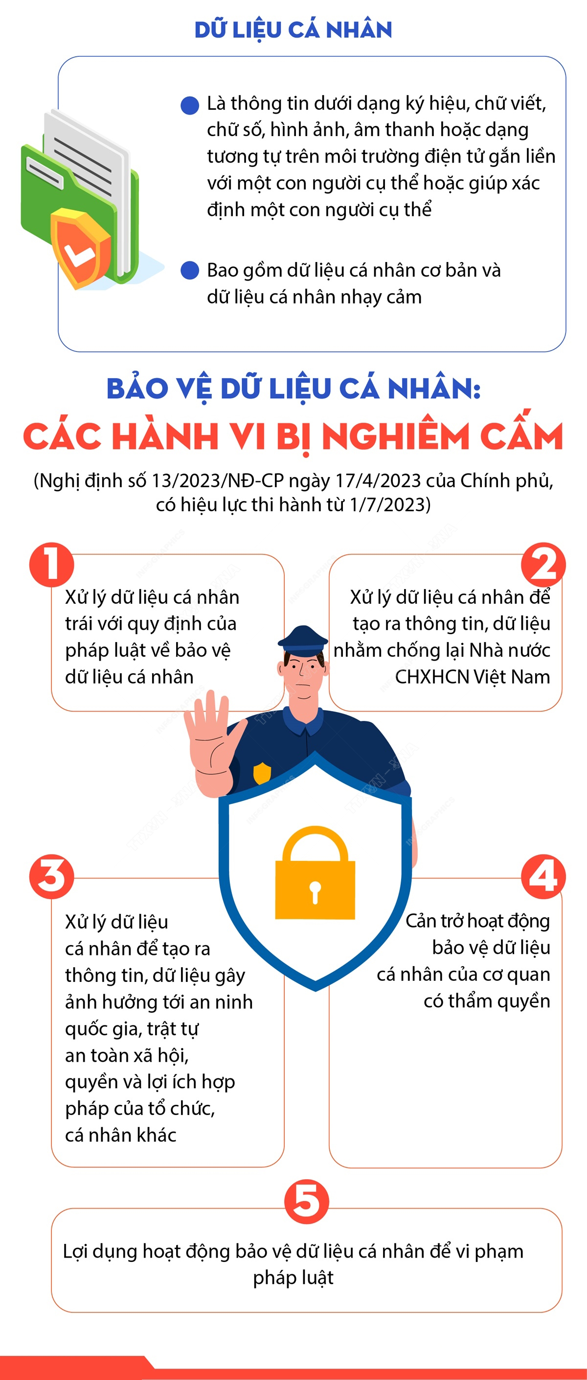 Theo Nghị định số 13/2023/NĐ-CP CP ngày 17/4/2023 của Chính phủ, biện pháp bảo vệ dữ liệu cá nhân được áp dụng ngay từ khi bắt đầu và trong suốt quá trình xử lý dữ liệu cá nhân. Các hành vi bị nghiêm cấm trong hoạt động bảo vệ dữ liệu cá nhân gồm: Xử lý dữ liệu cá nhân trái với quy định của pháp luật về bảo vệ dữ liệu cá nhân; xử lý dữ liệu cá nhân để tạo ra thông tin, dữ liệu nhằm chống lại Nhà nước CHXHCN Việt Nam; xử lý dữ liệu cá nhân để tạo ra thông tin, dữ liệu gây ảnh hưởng tới an ninh quốc gia, trật tự an toàn xã hội, quyền và lợi ích hợp pháp của tổ chức, cá nhân khác; cản trở hoạt động bảo vệ dữ liệu cá nhân của cơ quan có thẩm quyền và lợi dụng hoạt động bảo vệ dữ liệu cá nhân để vi phạm pháp luật. Nghị định có hiệu lực thi hành từ ngày 1/7/2023.
