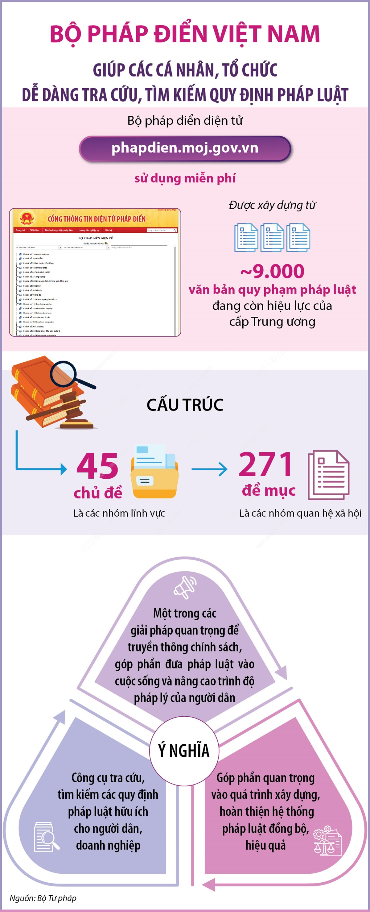 Bộ Tư pháp vừa công bố Bộ pháp điển Việt Nam tại địa chỉ phapdien.moj.gov.vn được xây dựng, hình thành từ gần 9.000 văn bản quy phạm pháp luật đang còn hiệu lực của cấp Trung ương và được sắp xếp, cấu trúc vào 45 chủ đề. Trong mỗi chủ đề có một hoặc nhiều đề mục. Mỗi đề mục được pháp điển từ nhiều văn bản khác nhau cùng điều chỉnh một lĩnh vực nhất định và được sắp xếp theo một trật tự khoa học, logic. Bộ pháp điển Việt Nam sẽ là công cụ tra cứu, tìm kiếm các quy định pháp luật hữu ích cho người dân, doanh nghiệp. Thông qua việc pháp điển, việc sắp xếp các quy phạm pháp luật có nội dung liên quan đến nhau vào một chỗ góp phần chỉ ra những quy định mâu thuẫn, chồng chéo, đánh dấu bước phát triển mới về bảo đảm tính công khai, minh bạch của hệ thống pháp luật Việt Nam.