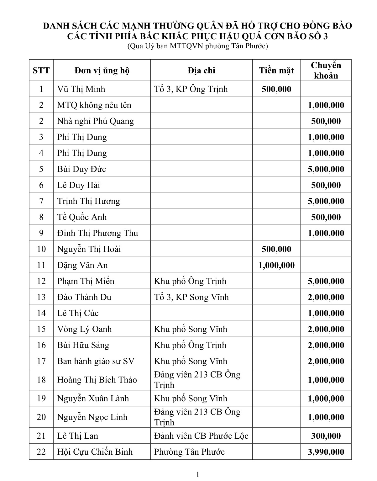 Uỷ ban MTTQVN phường Tân Phước vẫn tiếp tục tiếp nhận hỗ trợ từ quy mạnh thường quân, Kính mong các tổ chức, doanh nghiệp, cơ sở tôn giáo, các tầng lớp nhân dân cùng chung tay ủng hộ đồng bào Miền Bắc khắc phục thiệt hại do cơn bão số 3 gây ra.