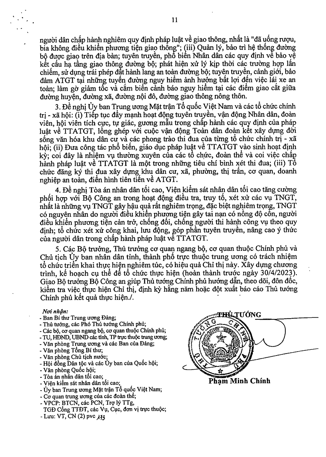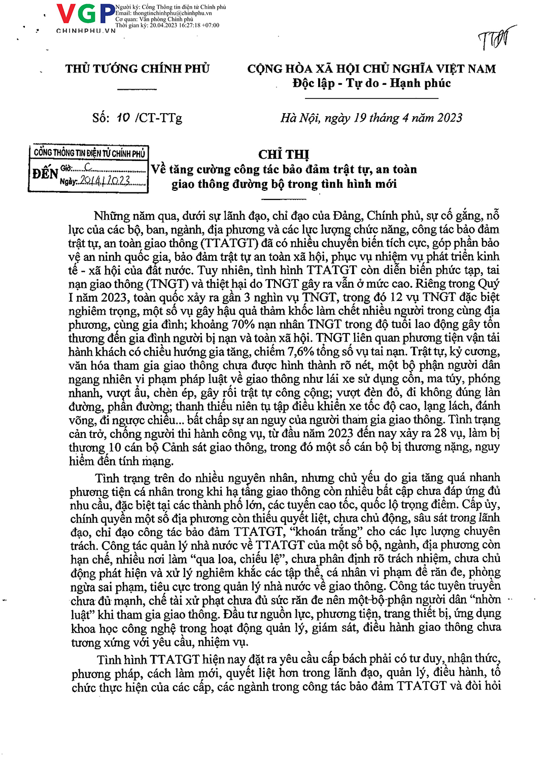 Ngày 19-04-2023, Thủ tướng Chính phủ đã ký ban hành Chỉ thị Về tăng cường công tác bảo đảm trật tự, an toàn giao thông đường bộ trong tình hình mới. UBND phường Tân Phước giới thiệu nội dung Chỉ thị để các cơ quan, CBCC và nhân dân biết và thực hiện.