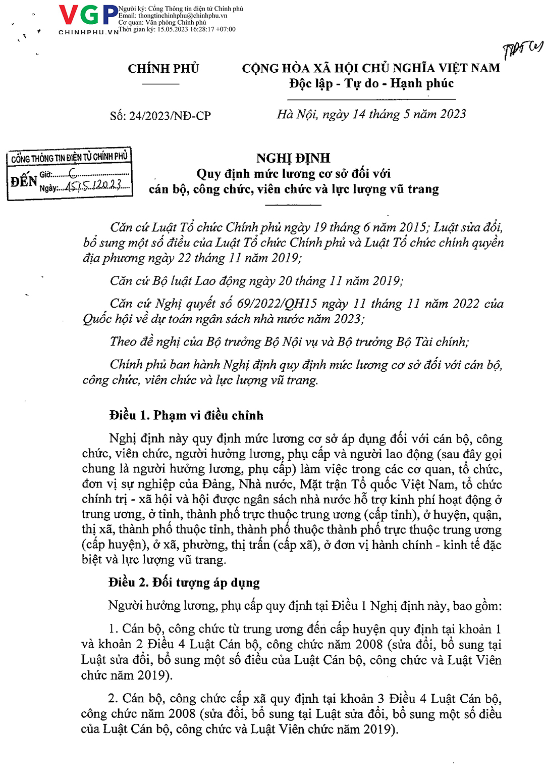 Chính phủ ban hành Nghị định 24/2023/NĐ-CP tăng lương cơ sở lên 1,8 triệu đồng từ 1-7-2023