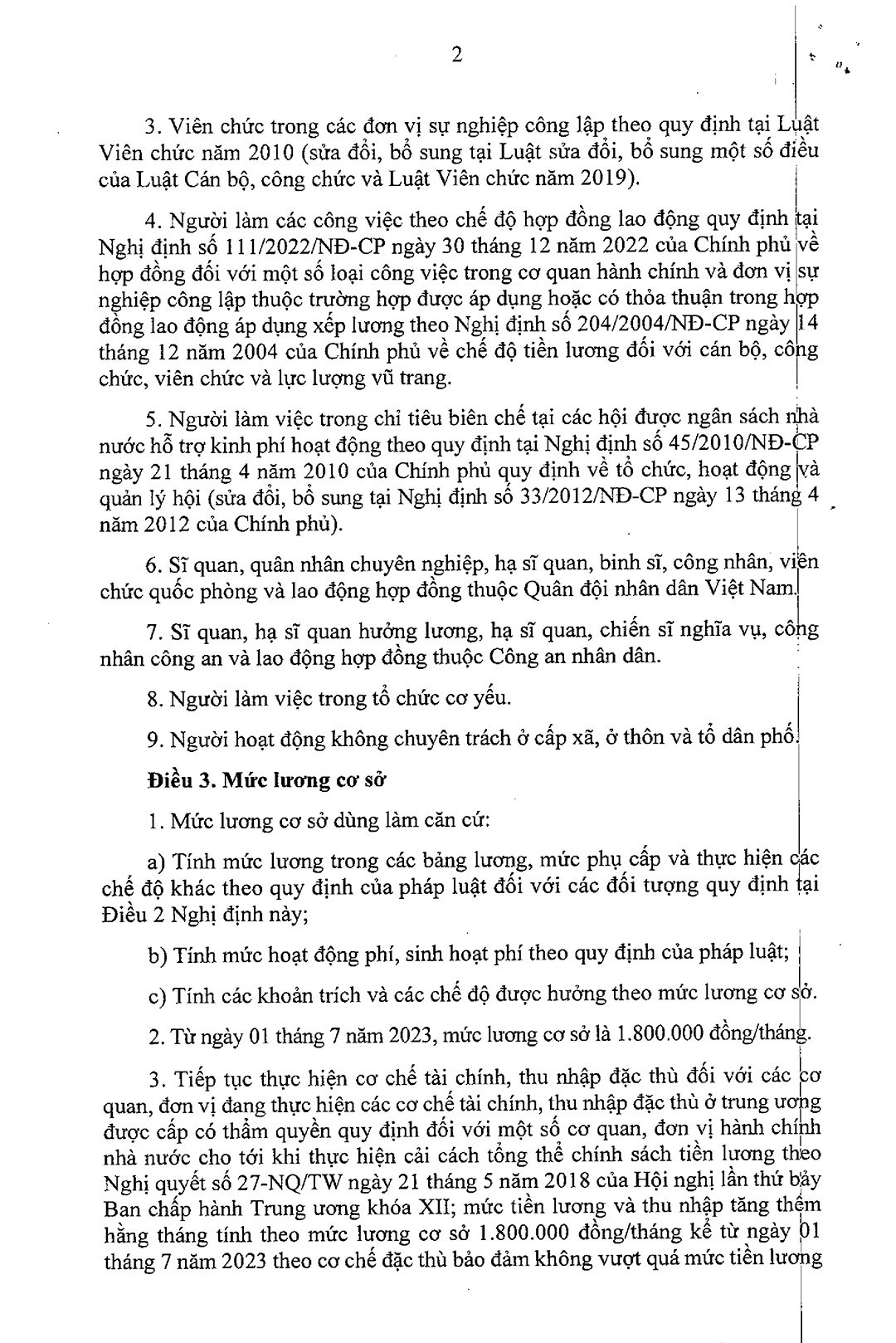 Nghị định này quy định mức lương cơ sở áp dụng đối với cán bộ, công chức, viên chức, người hưởng lương, phụ cấp và người lao động (sau đây gọi chung là người hưởng lương, phụ cấp) làm việc trong các cơ quan, tổ chức, đơn vị sự nghiệp của Đảng, Nhà nước, Mặt trận Tổ quốc Việt Nam, tổ chức chính trị-xã hội và hội được ngân sách nhà nước hỗ trợ kinh phí hoạt động ở Trung ương, ở tỉnh, thành phố trực thuộc Trung ương (cấp tỉnh), ở huyện, quận, thị xã, thành phố thuộc tỉnh, thành phố thuộc thành phố trực thuộc Trung ương (cấp huyện), ở xã, phường, thị trấn (cấp xã), ở đơn vị hành chính-kinh tế đặc biệt và lực lượng vũ trang.