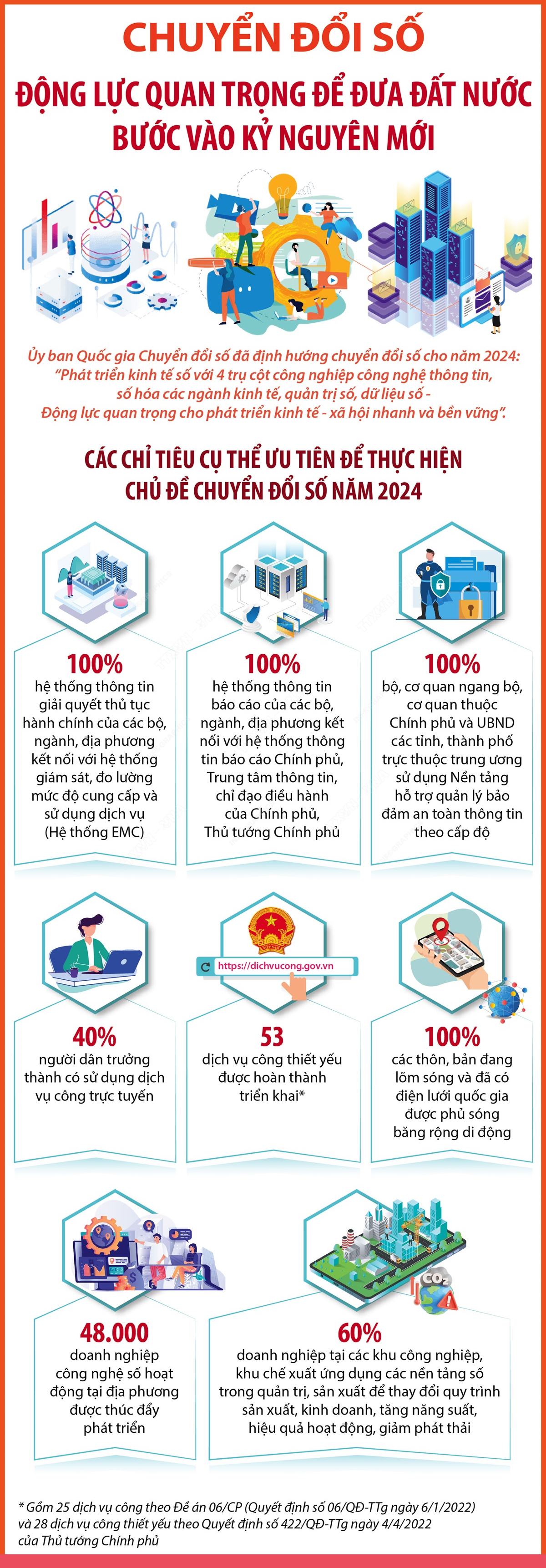 Ủy ban Quốc gia về chuyển đổi số đã đề ra các chỉ tiêu cụ thể ưu tiên để thực hiện chủ đề chuyển đổi số năm 2024 “Phát triển kinh tế số với 4 trụ cột công nghiệp công nghệ thông tin, số hóa các ngành kinh tế, quản trị số, dữ liệu số – Động lực quan trọng cho phát triển kinh tế-xã hội nhanh và bền vững”.