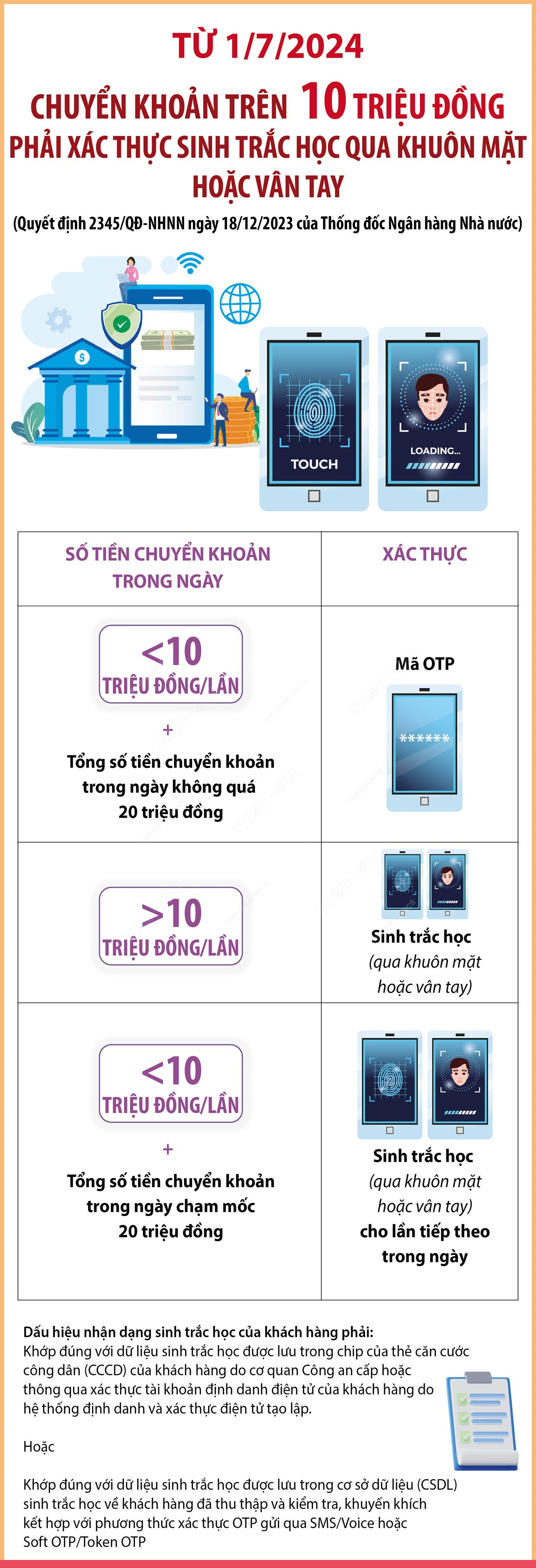 Chuyển khoản trên 10 triệu phải xác thực sinh trắc học qua khuôn mặt hoặc vân tay từ ngày 01-7-2024