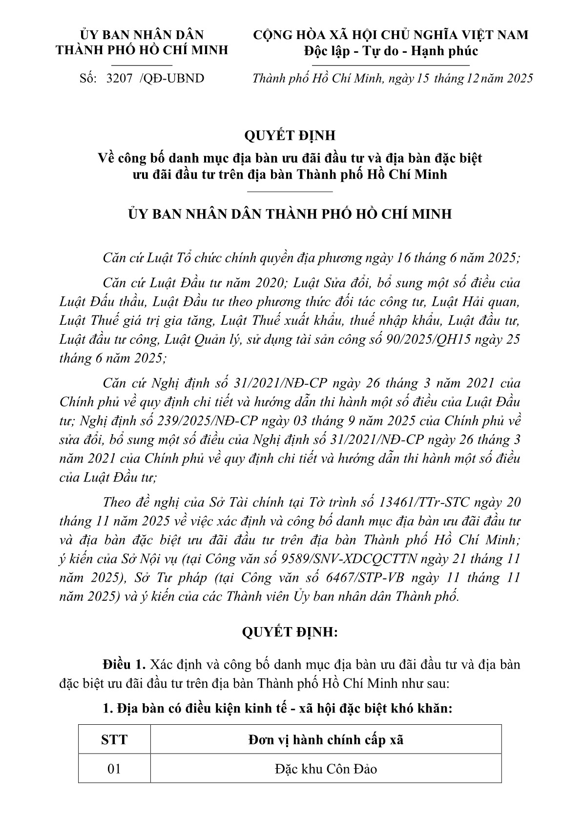 Ngày 15/12/2025, UBND thành phố Hồ Chí Minh đã ban hành Quyết định số 3207/QĐ-UBND công bố danh mục địa bàn ưu đãi đầu tư và địa bàn đặc biệt ưu đãi đầu tư trên địa bàn Thành phố Hồ Chí Minh.