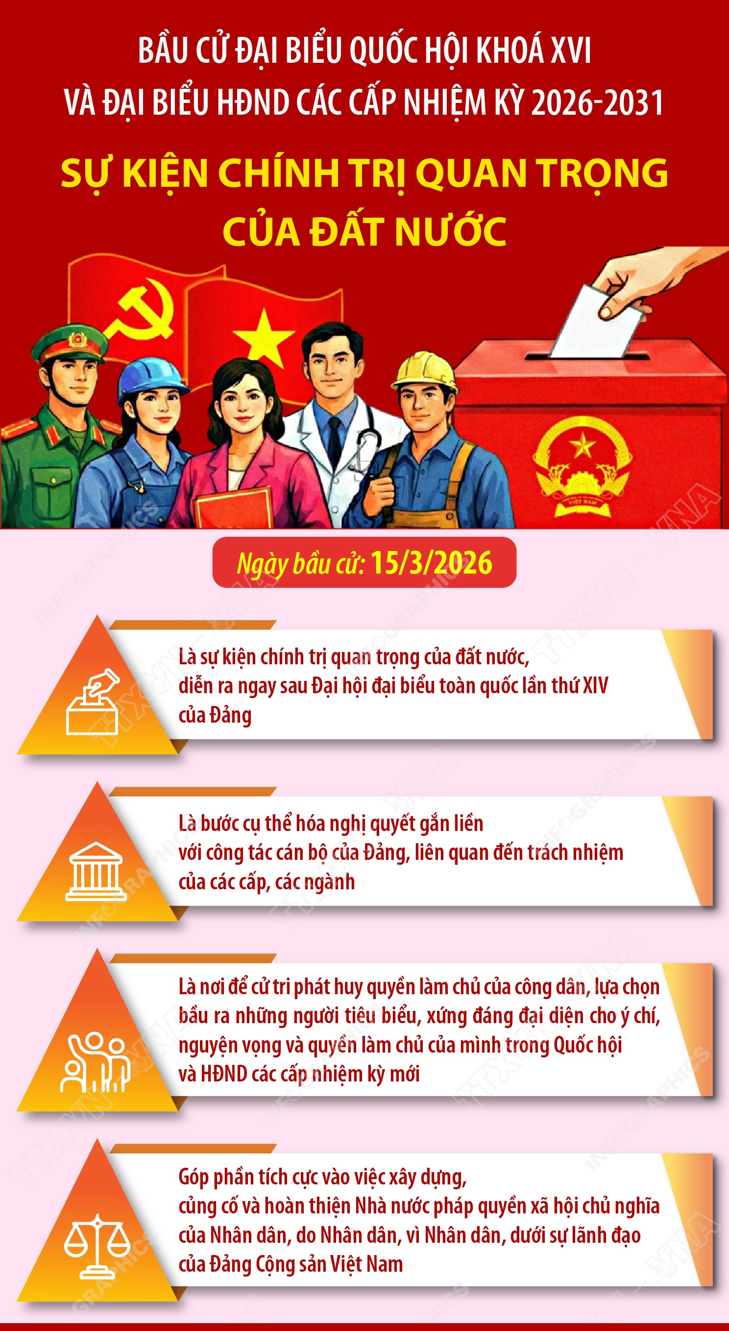 Cuộc bầu cử đại biểu Quốc hội khóa XVI và đại biểu HĐND các cấp nhiệm kỳ 2026-2031 được tổ chức ngày 15/3/2026 trên phạm vi cả nước. Đây là sự kiện chính trị quan trọng của đất nước, diễn ra ngay sau Đại hội đại biểu toàn quốc lần thứ XIV của Đảng; là bước cụ thể hóa nghị quyết gắn liền với công tác cán bộ của Đảng, liên quan đến trách nhiệm của các cấp, các ngành; là nơi để cử tri phát huy quyền làm chủ của công dân, lựa chọn bầu ra những người tiêu biểu, xứng đáng đại diện cho ý chí, nguyện vọng và quyền làm chủ của mình trong Quốc hội và HĐND các cấp nhiệm kỳ mới. Cuộc bầu cử góp phần tích cực vào việc xây dựng, củng cố và hoàn thiện Nhà nước pháp quyền XHCN của Nhân dân, do Nhân dân, vì Nhân dân, dưới sự lãnh đạo của Đảng Cộng sản Việt Nam.