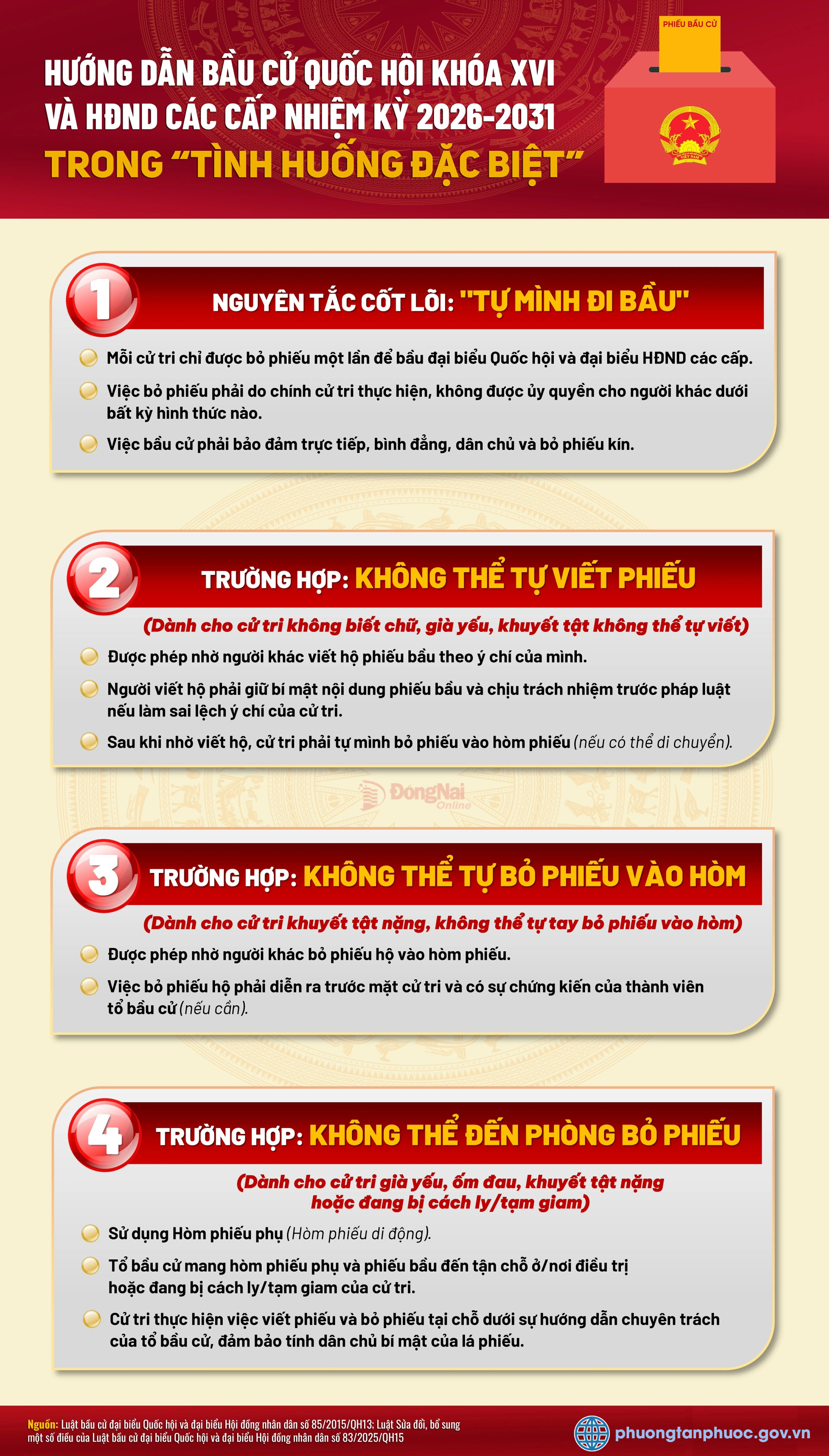 Cuộc bầu cử đại biểu Quốc hội khóa XVI và đại biểu HĐND các cấp nhiệm kỳ 2026-2031 sẽ được tiến hành vào ngày 15-3-2026. Đây là sự kiện chính trị quan trọng của đất nước nhằm lựa chọn những đại biểu tiêu biểu, xứng đáng đại diện cho ý chí, nguyện vọng và quyền làm chủ của nhân dân. Trong mọi điều kiện, kể cả các tình huống đặc biệt như ốm đau, già yếu, khuyết tật hoặc không thể đến khu vực bỏ phiếu, cử tri vẫn được bảo đảm thực hiện quyền bầu cử theo nguyên tắc “tự mình đi bầu”, trực tiếp, bình đẳng và bỏ phiếu kín theo quy định của pháp luật.