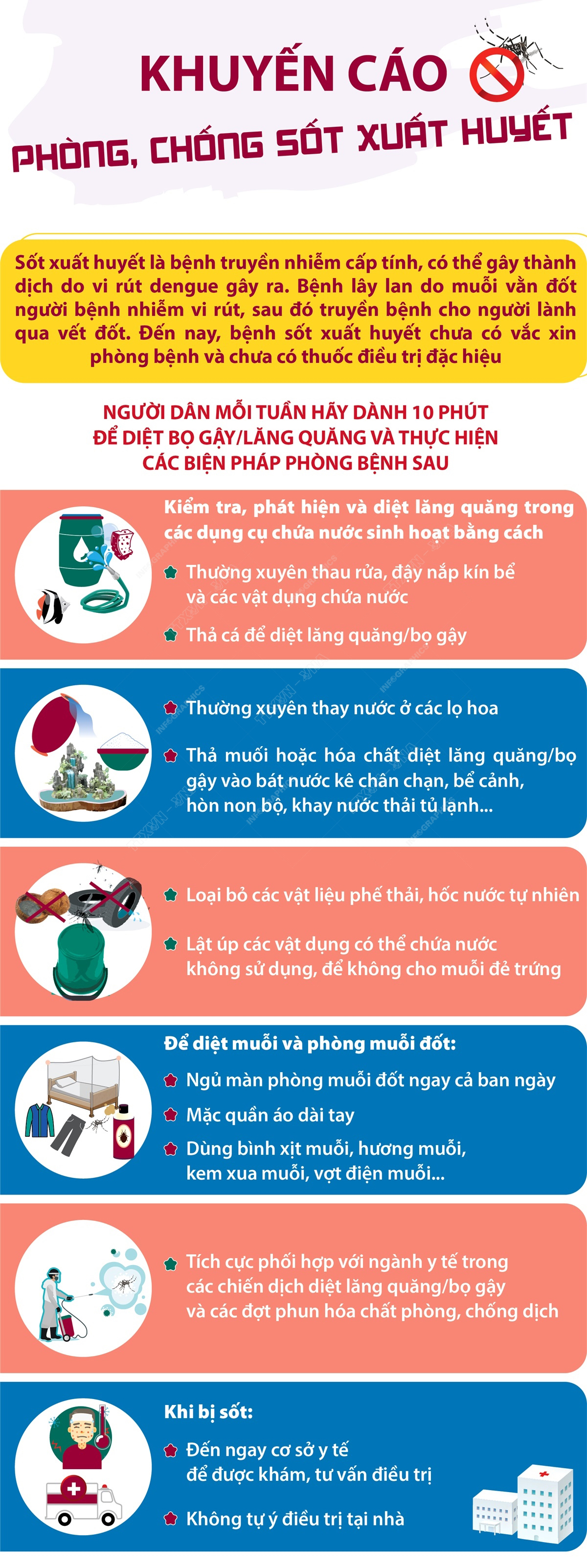 Số ca mắc sốt xuất huyết tiếp tục có xu hướng tăng, một số ổ dịch có nhiều bệnh nhân, diễn biến phức tạp. Để tích cực phòng bệnh cho bản thân, gia đình và mọi người xung quanh, Bộ Y tế khuyến cáo người dân mỗi tuần hãy dành 10 phút để diệt bọ gậy/lăng quăng và thực hiện các biện pháp phòng bệnh.