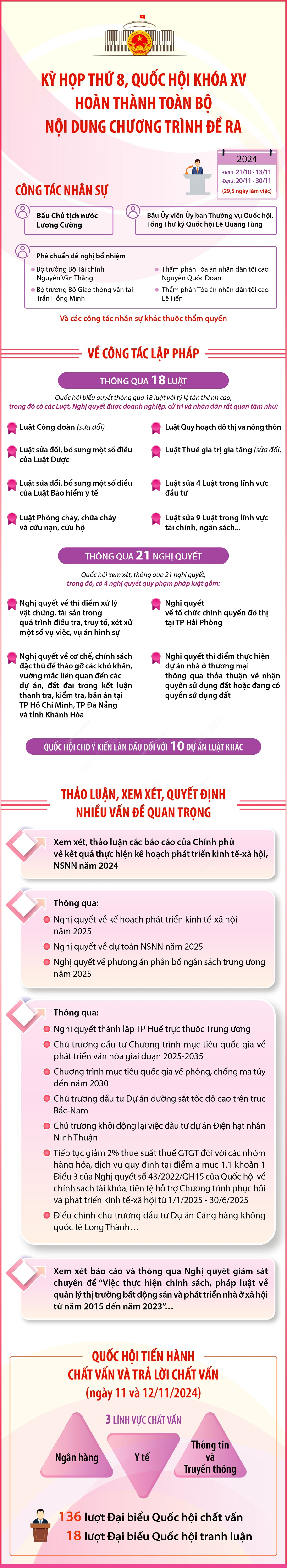 Sau một tháng làm việc nghiêm túc, khoa học, dân chủ, trách nhiệm cao, với tinh thần đổi mới, kịp thời tháo gỡ khó khăn, vướng mắc, khắc phục các điểm nghẽn, khơi thông nguồn lực, tập trung cao độ phục vụ phát triển kinh tế – xã hội, bảo đảm quốc phòng, an ninh và nâng cao đời sống của nhân dân, Kỳ họp thứ 8, Quốc hội khóa XV đã hoàn thành toàn bộ nội dung chương trình đề ra.