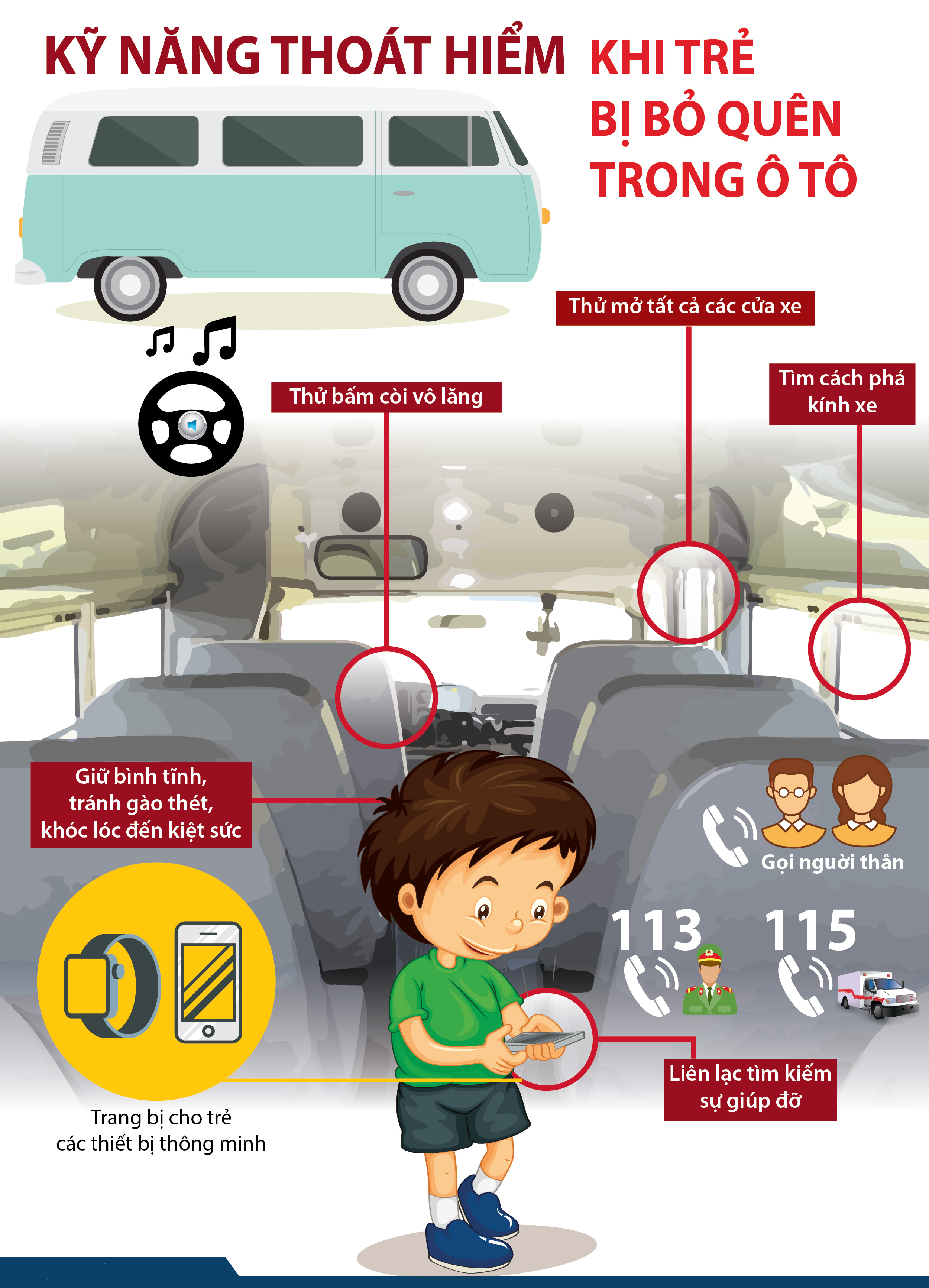 Trẻ em cần được nhà trường và cha mẹ dạy về những kỹ năng cần thiết để biết cách tự vệ và tăng khả năng sống sót khi bị bỏ quên trong xe ô tô đóng kín cửa. Hãy chia sẻ thông tin này để các bậc cha mẹ và các em được biết.