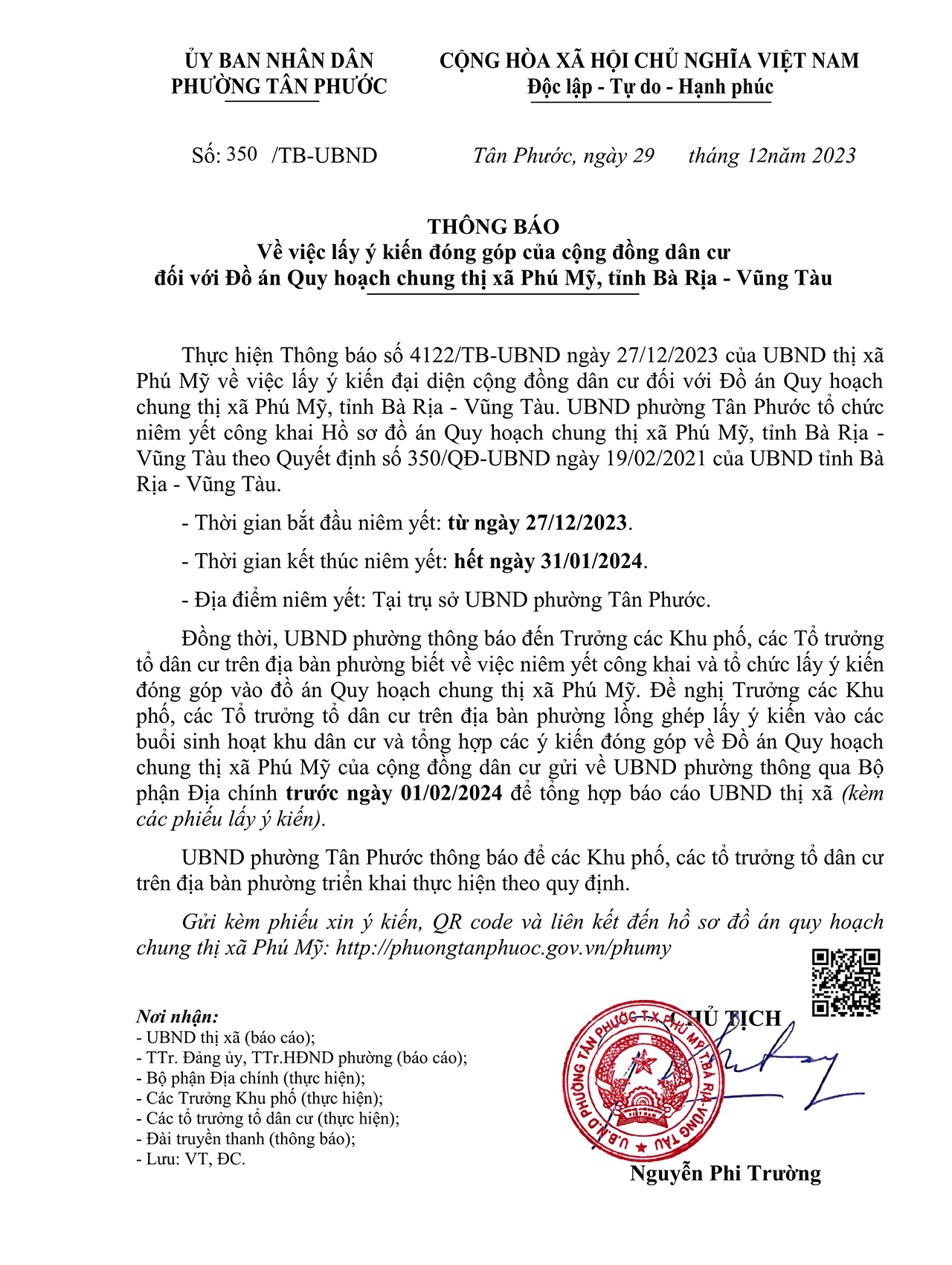 UBND phường Tân Phước thông báo lấy ý kiến đóng góp của cộng đồng dân cư đối với Đồ án Quy hoạch chung thị xã Phú Mỹ, tỉnh Bà Rịa – Vũng Tàu. Liên kết đến hồ sơ đồ án quy hoạch chung thị xã Phú Mỹ: http://phuongtanphuoc.gov.vn/phumy