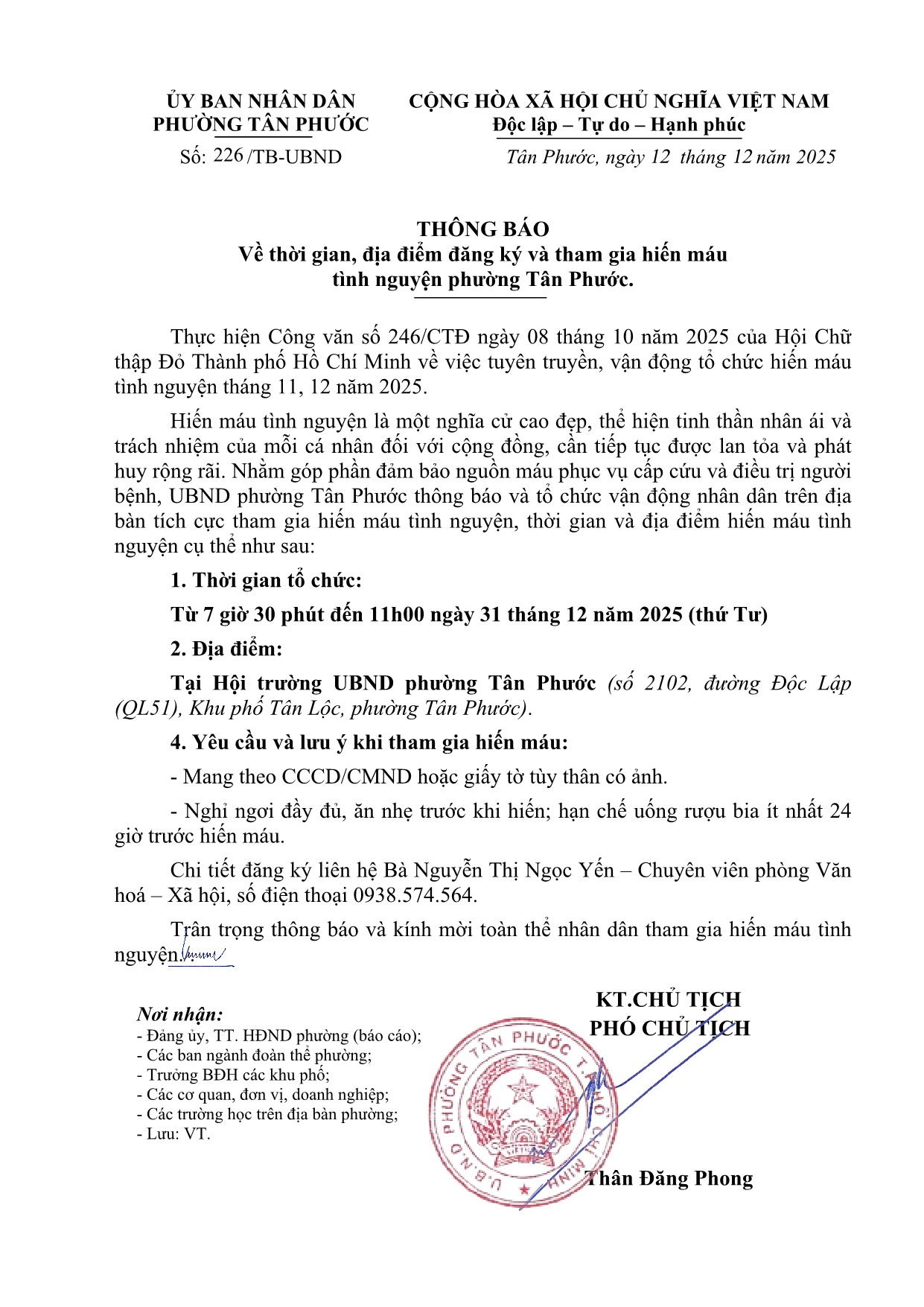 Địa điểm: Hội trường UBND phường Tân Phước (số 2102, QL51, phường Tân Phước – UBND phường Phước Hoà cũ).