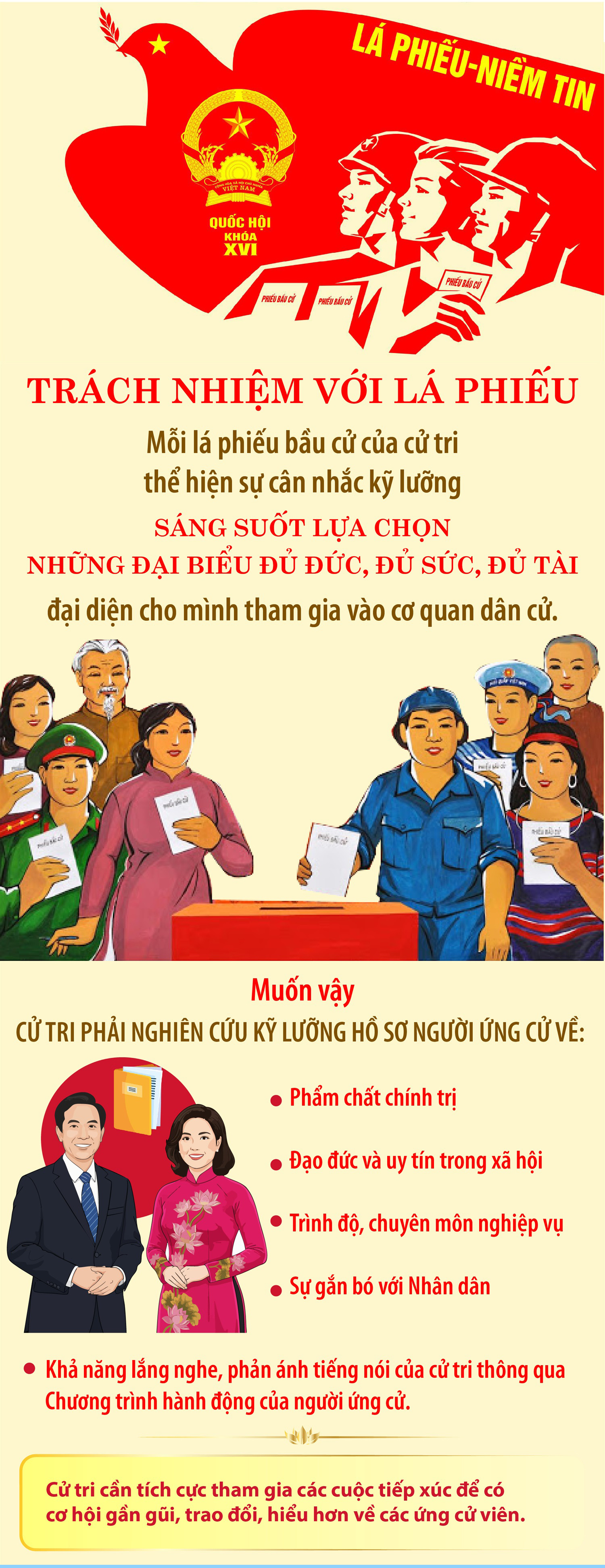 Cuộc bầu cử Quốc hội khóa XVI và Hội đồng nhân dân các cấp nhiệm kỳ 2026-2031 diễn ra ngày 15/3/2026. Mỗi lá phiếu bầu của cử tri thể hiện sự cân nhắc kỹ lưỡng, sáng suốt lựa chọn những đại biểu đủ đức, đủ sức, đủ tài, đại diện cho mình tham gia vào cơ quan dân cử. Muốn vậy, cử tri phải nghiên cứu kỹ lưỡng hồ sơ người ứng cử về: Phẩm chất chính trị; Đạo đức và uy tín trong xã hội; Trình độ, chuyên môn nghiệp vụ; Sự gắn bó với Nhân dân; Khả năng lắng nghe, phản ánh tiếng nói của cử tri thông qua Chương trình hành động của người ứng cử.