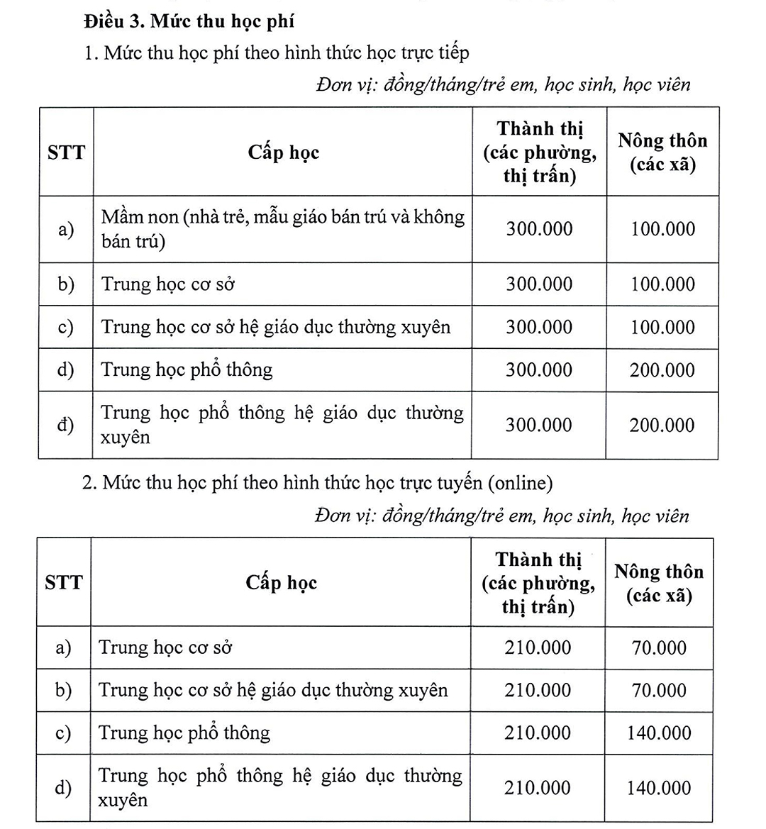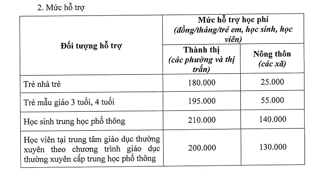 Học sinh THPT mức hỗ trợ 01 học sinh/tháng là 210.000đ khu vực thành thị và 140.000đ khu vực nông thôn.