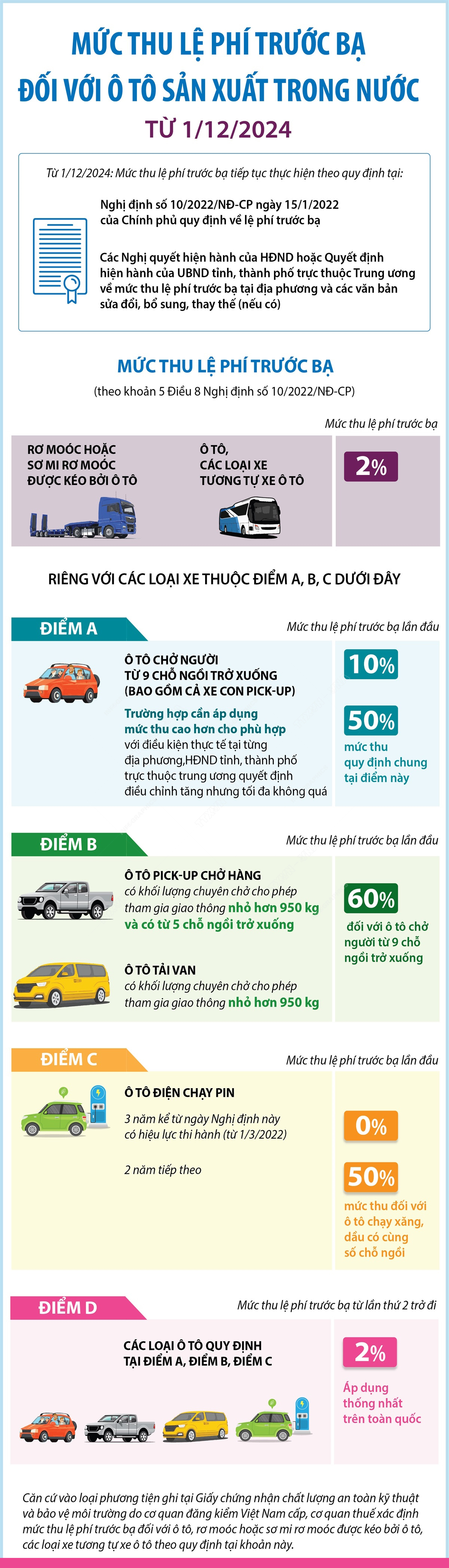 Từ ngày 1/12/2024, chính sách giảm 50% lệ phí trước bạ ô tô sản xuất trong nước nêu trên sẽ kết thúc. Khi đó, mức thu lệ phí trước bạ ô tô sản xuất trong nước sẽ trở lại áp dụng theo quy định tại Nghị định 10/2022/NĐ-CP quy định về lệ phí trước bạ; các Nghị quyết hiện hành của HĐND hoặc Quyết định hiện hành của UBND tỉnh, thành phố trực thuộc trung ương về mức thu lệ phí trước bạ tại địa phương và các văn bản sửa đổi, bổ sung, thay thế (nếu có).