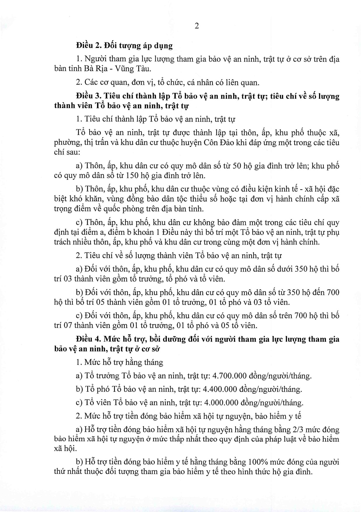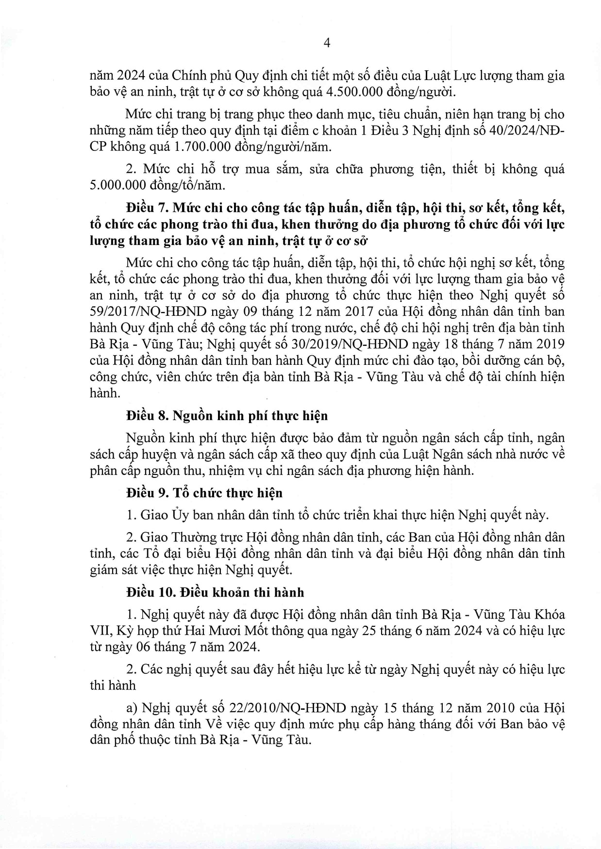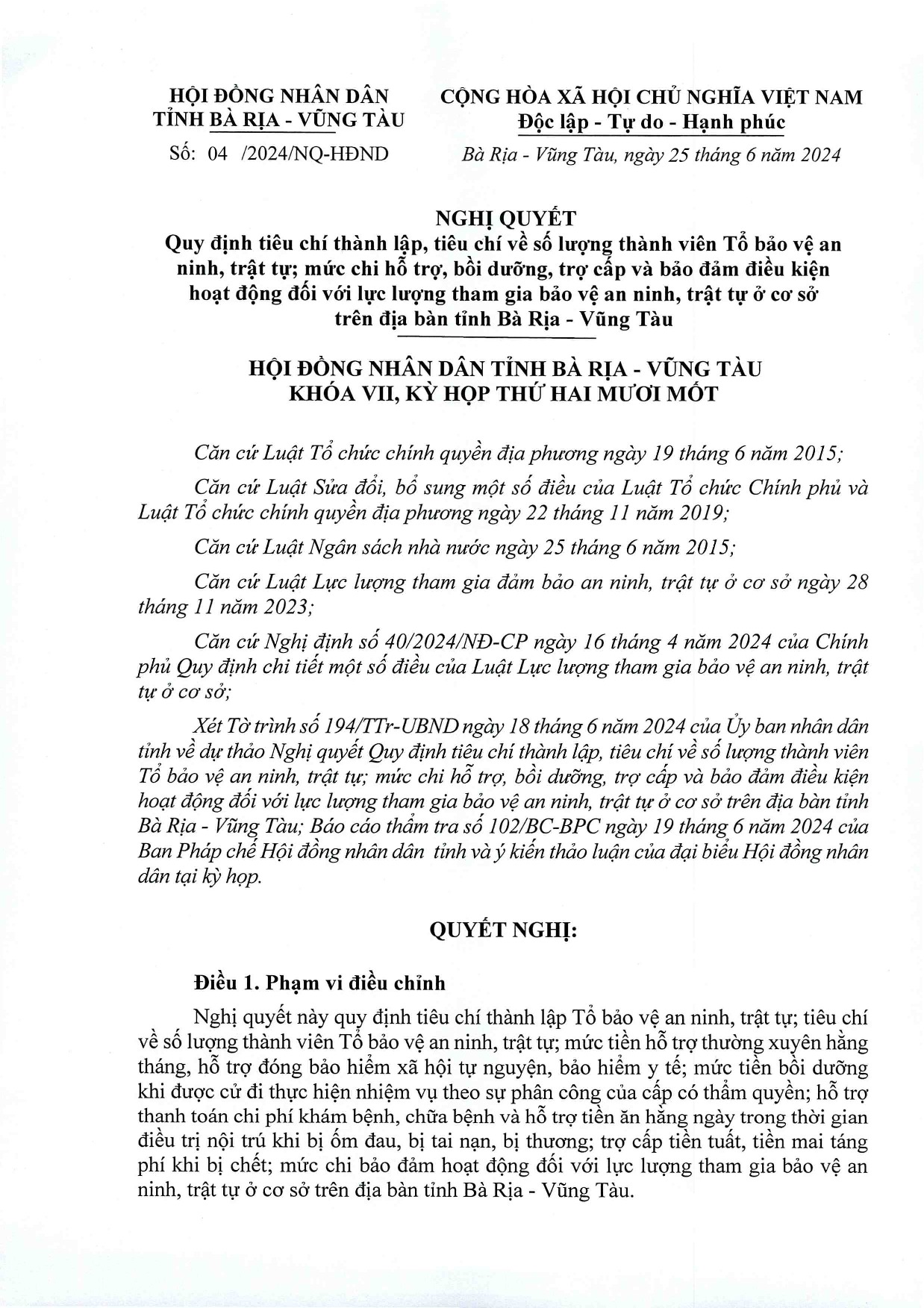 Hội đồng nhân dân tỉnh Bà Rịa – Vũng Tàu đã ban hành Nghị quyết 04/2024/NQ-HĐND ngày 25/6/2024 quy định tiêu chí thành lập, tiêu chí về số lượng thành viên Tổ bảo vệ an ninh, trật tự; mức chi hỗ trợ, bồi dưỡng, trợ cấp và bảo đảm điều kiện hoạt động đối với lực lượng tham gia bảo vệ an ninh, trật tự ở cơ sở trên địa bàn tỉnh Bà Rịa – Vũng Tàu.