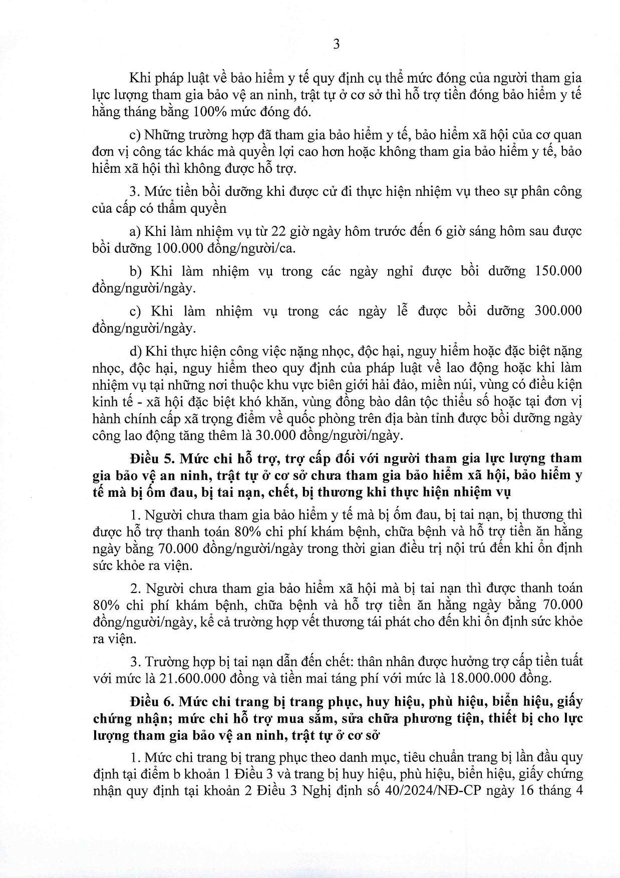 Nghị quyết cũng quy định mức hỗ trợ hằng tháng với người tham gia lực lượng tham gia bảo vệ an ninh, trật tự ở cơ sở.