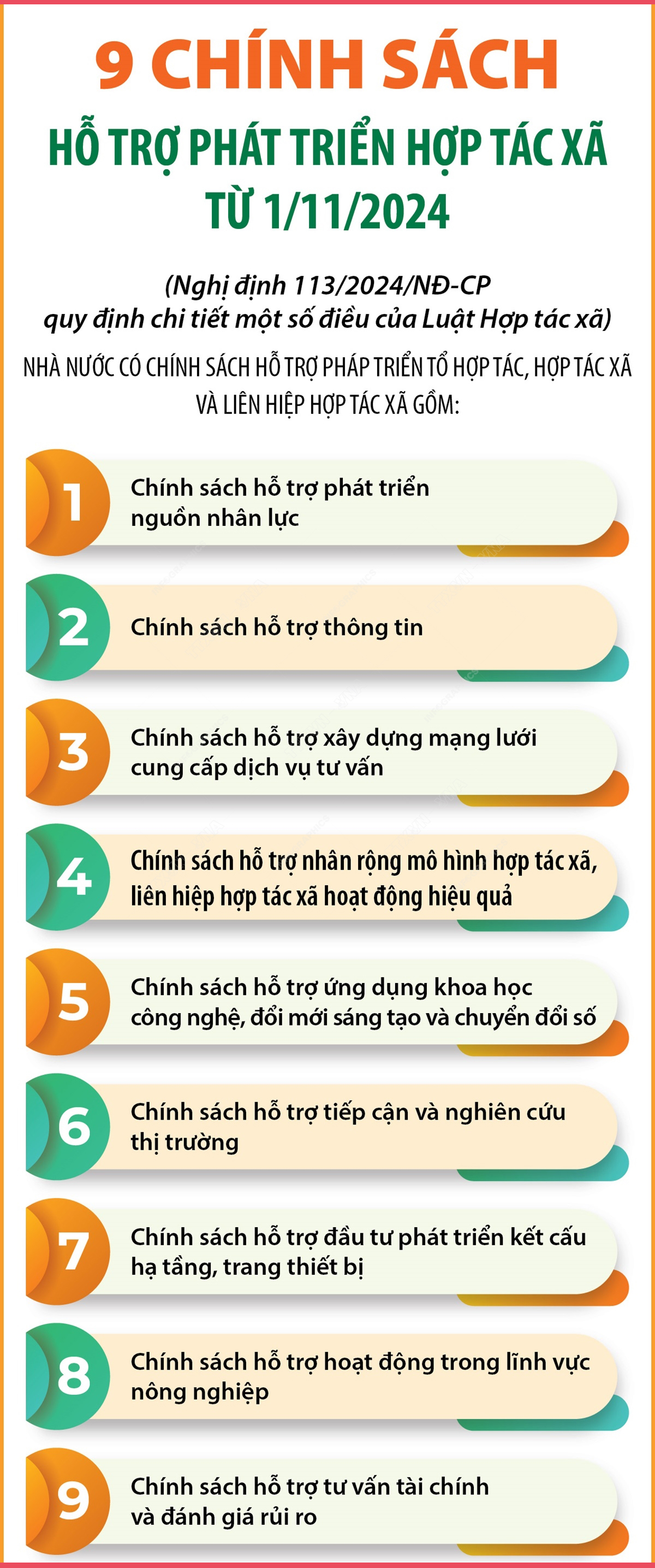 Theo Nghị định 113/2024/NĐ-CP quy định chi tiết một số điều của Luật Hợp tác xã, từ 1/11/2024, Nhà nước có 9 chính sách hỗ trợ pháp triển tổ hợp tác, hợp tác xã và liên hiệp hợp tác xã gồm: Chính sách hỗ trợ phát triển nguồn nhân lực; Chính sách hỗ trợ thông tin; Chính sách hỗ trợ xây dựng mạng lưới cung cấp dịch vụ tư vấn; Chính sách hỗ trợ nhân rộng mô hình hợp tác xã, liên hiệp hợp tác xã hoạt động hiệu quả; Chính sách hỗ trợ ứng dụng khoa học công nghệ, đổi mới sáng tạo và chuyển đổi số; Chính sách hỗ trợ tiếp cận và nghiên cứu thị trường; Chính sách hỗ trợ đầu tư phát triển kết cấu hạ tầng, trang thiết bị; Chính sách hỗ trợ hoạt động trong lĩnh vực nông nghiệp; Chính sách hỗ trợ tư vấn tài chính và đánh giá rủi ro.