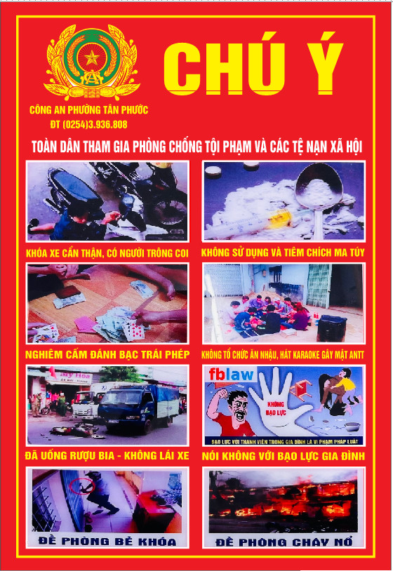 Thông tin toàn dân cảnh giác phòng chống các loại tội phạm, tệ nạn xã hội, phòng cháy chữa cháy và số điện thoại đường dây nóng Công an phường Tân Phước.