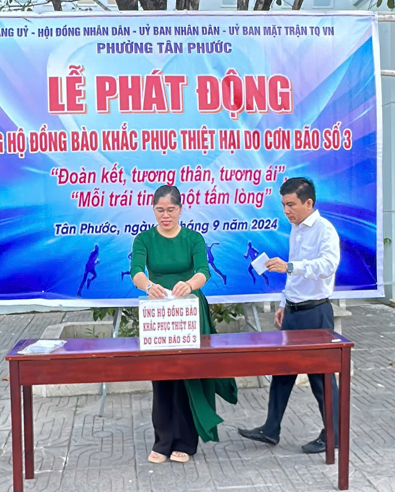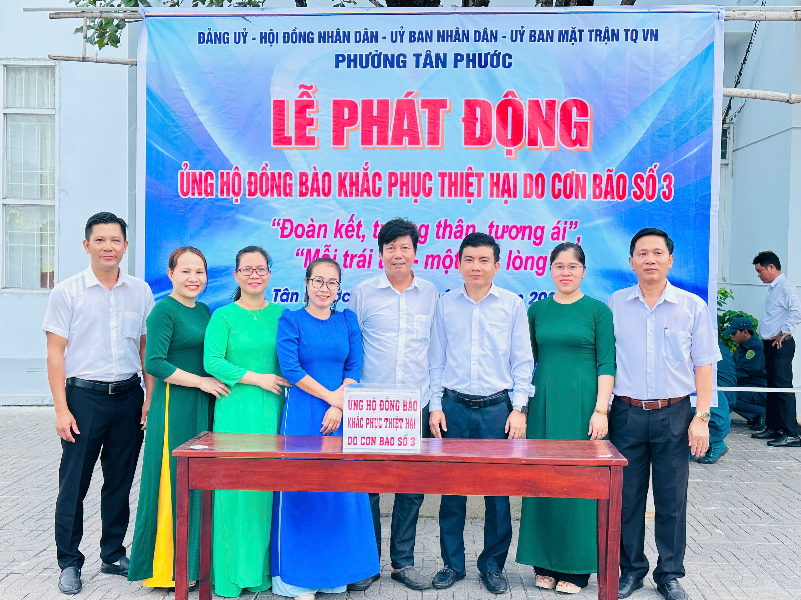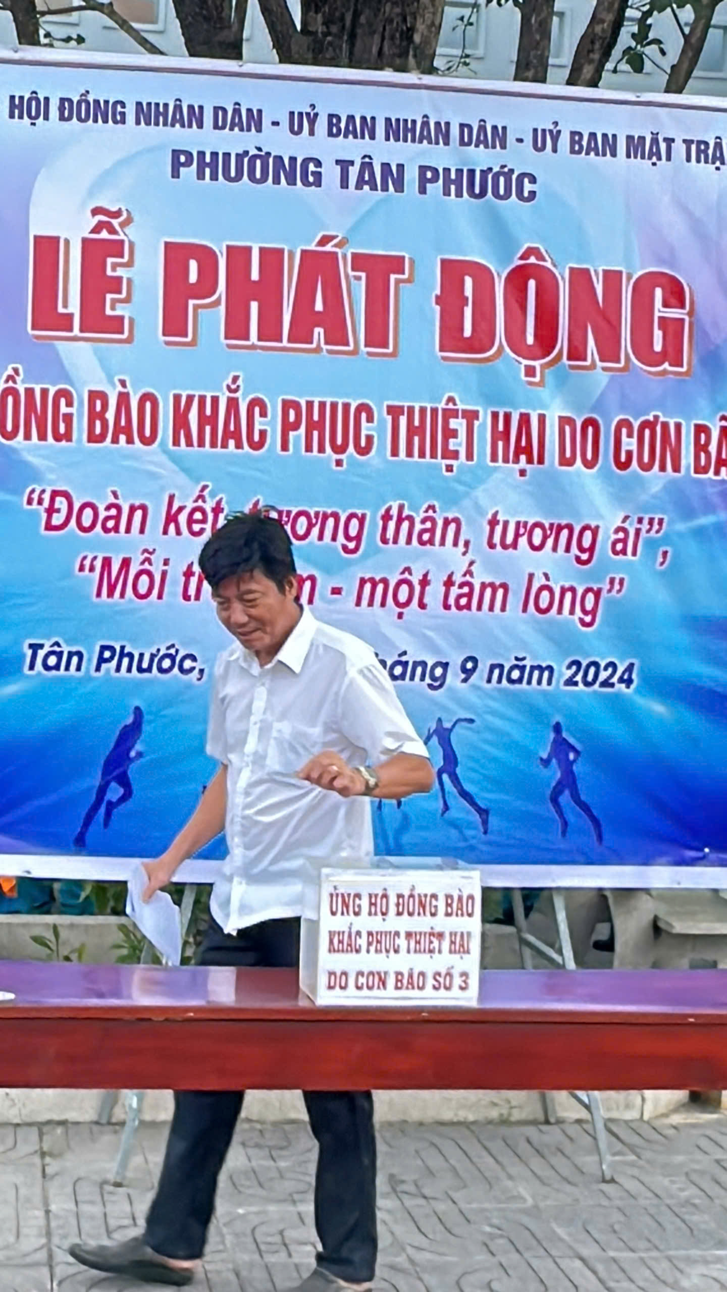 Hưởng ứng lời kêu gọi của Đoàn Chủ tịch Uỷ ban Trung ương MTTQ Việt Nam và Uỷ ban MTTQVN tỉnh Bà Rịa-Vũng Tàu, UBMTTQVN thị xã Phú Mỹ. Sáng 16/9/2024, phường Tân Phước, thị xã Phú Mỹ tổ chức Lễ phát động kêu gọi toàn thể cán bộ, công chức, người lao động, lực lượng vũ trang phường ủng hộ đồng bào bị thiệt hại sau Bão số 3.