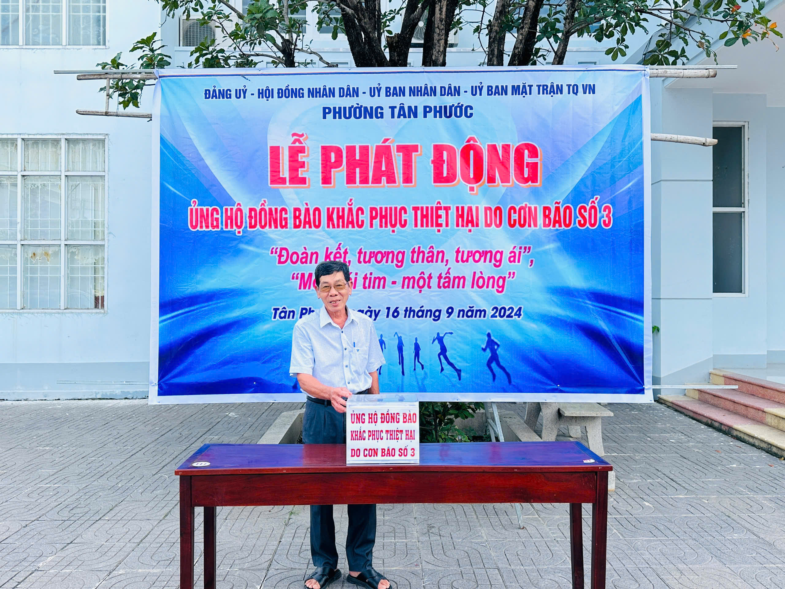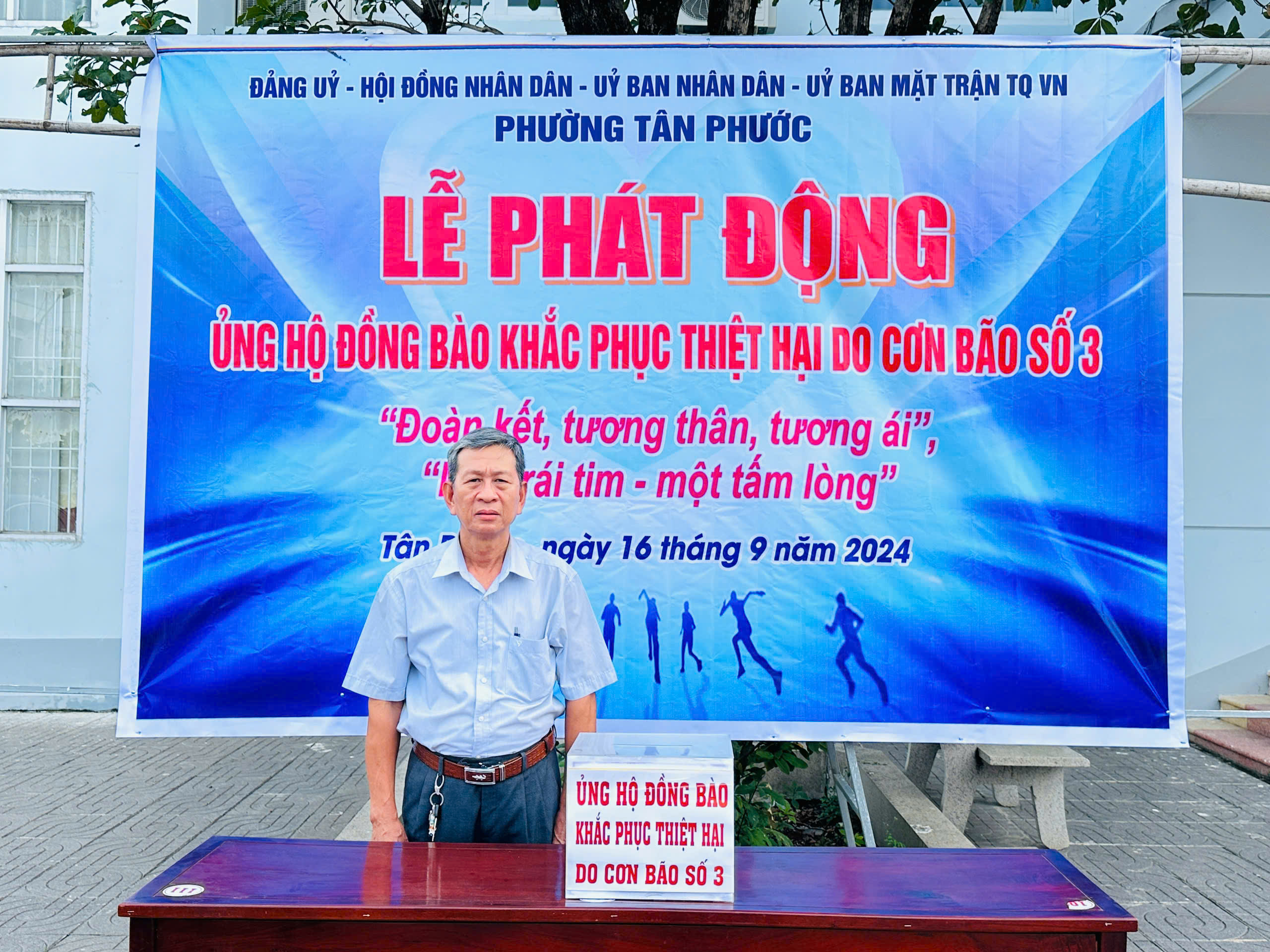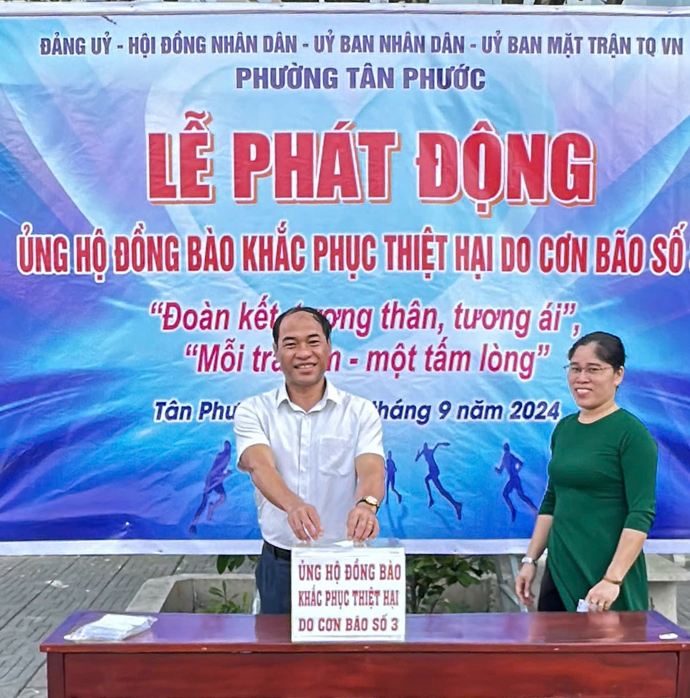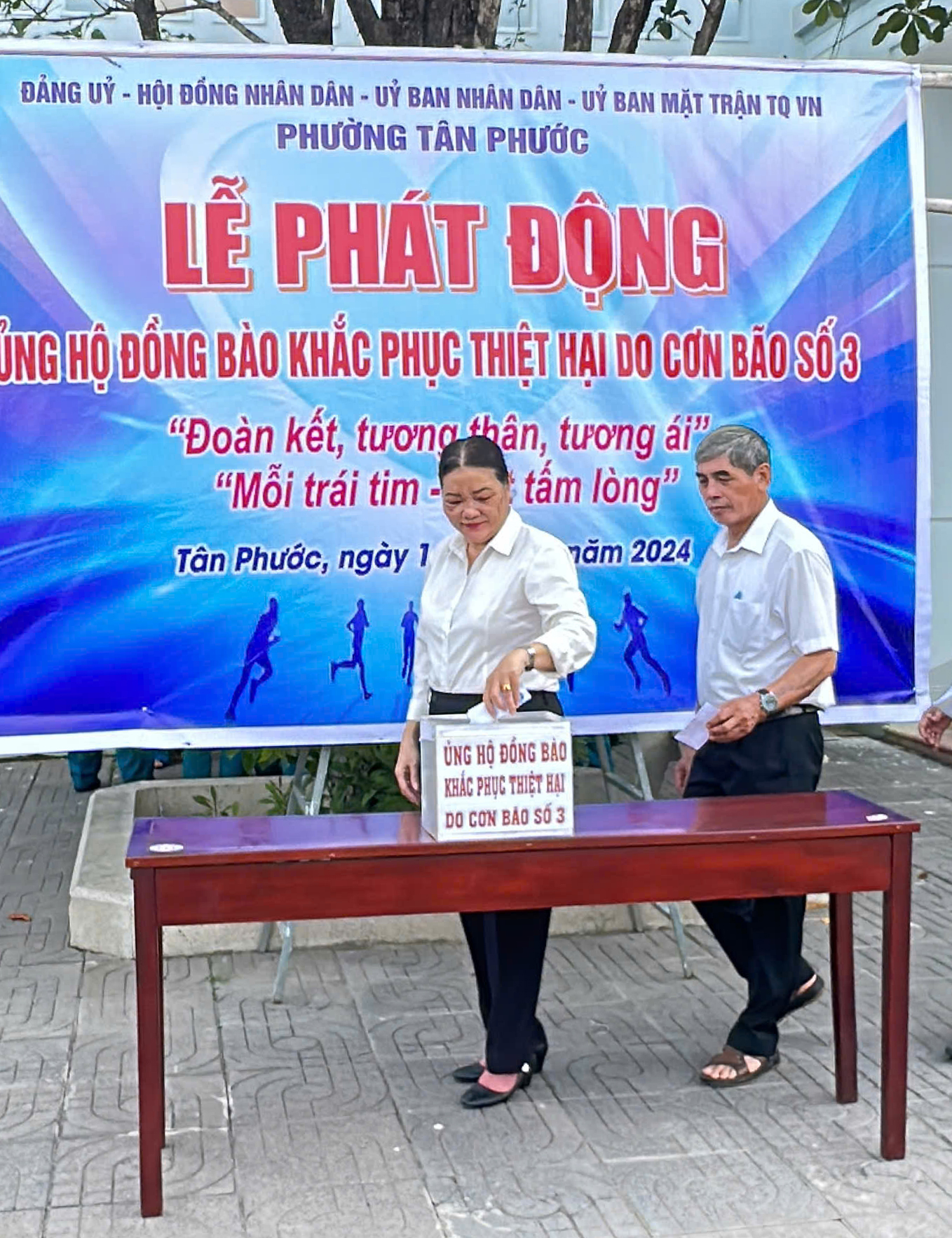Hưởng ứng lời kêu gọi của Đoàn Chủ tịch Uỷ ban Trung ương MTTQ Việt Nam và Uỷ ban MTTQVN tỉnh Bà Rịa-Vũng Tàu, UBMTTQVN thị xã Phú Mỹ. Sáng 16/9/2024, phường Tân Phước, thị xã Phú Mỹ tổ chức Lễ phát động kêu gọi toàn thể cán bộ, công chức, người lao động, lực lượng vũ trang phường ủng hộ đồng bào bị thiệt hại sau Bão số 3.