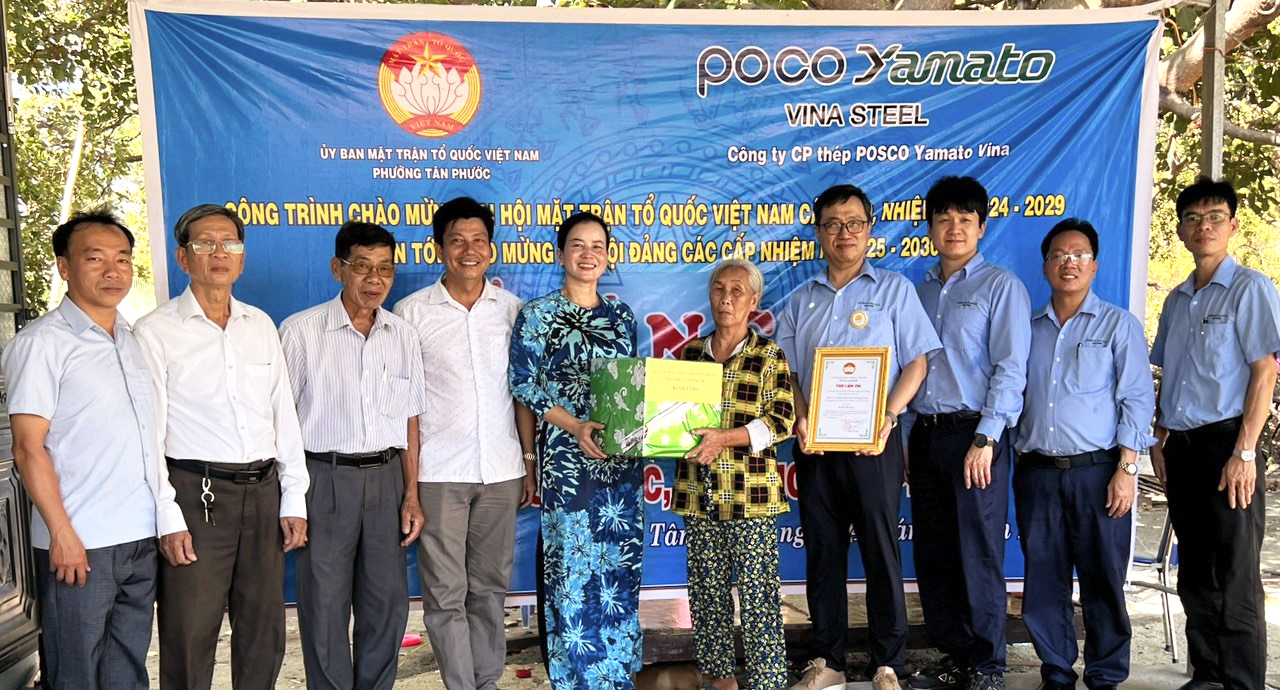 Chiều ngày 25/4/2024, Mặt trận tổ quốc Việt Nam Phường Tân Phước tổ chức nghiệm thu, bàn giao công trình sửa chữa nhà cho hộ dân khó khăn là hộ bà Nguyễn Thị Hoa, thuộc Tổ 01, khu phố Phước Lộc, phường Tân Phước, thuộc diện gia đình khó khăn, Mặt trận tổ quốc phường Tân Phước đã vận động và được sự chung tay của Cổ phần Thép POSSCO Yamato VINA tài trợ 40 triệu đồng, bên cạnh đó Ban hành giáo, giáo xứ Phước Lộc hỗ trợ 100 bao xi măng, Công ty cổ phần Thanh Tâm hỗ trợ 15m3 cát xây dựng và nâng cấp nền nhà. Sau gần 01 tháng thi công công trình đã hoàn thành, đảm bảo chất lượng, được nghiệm thu và đưa vào sử dụng với tổng kinh phí gần 70 triệu đồng.