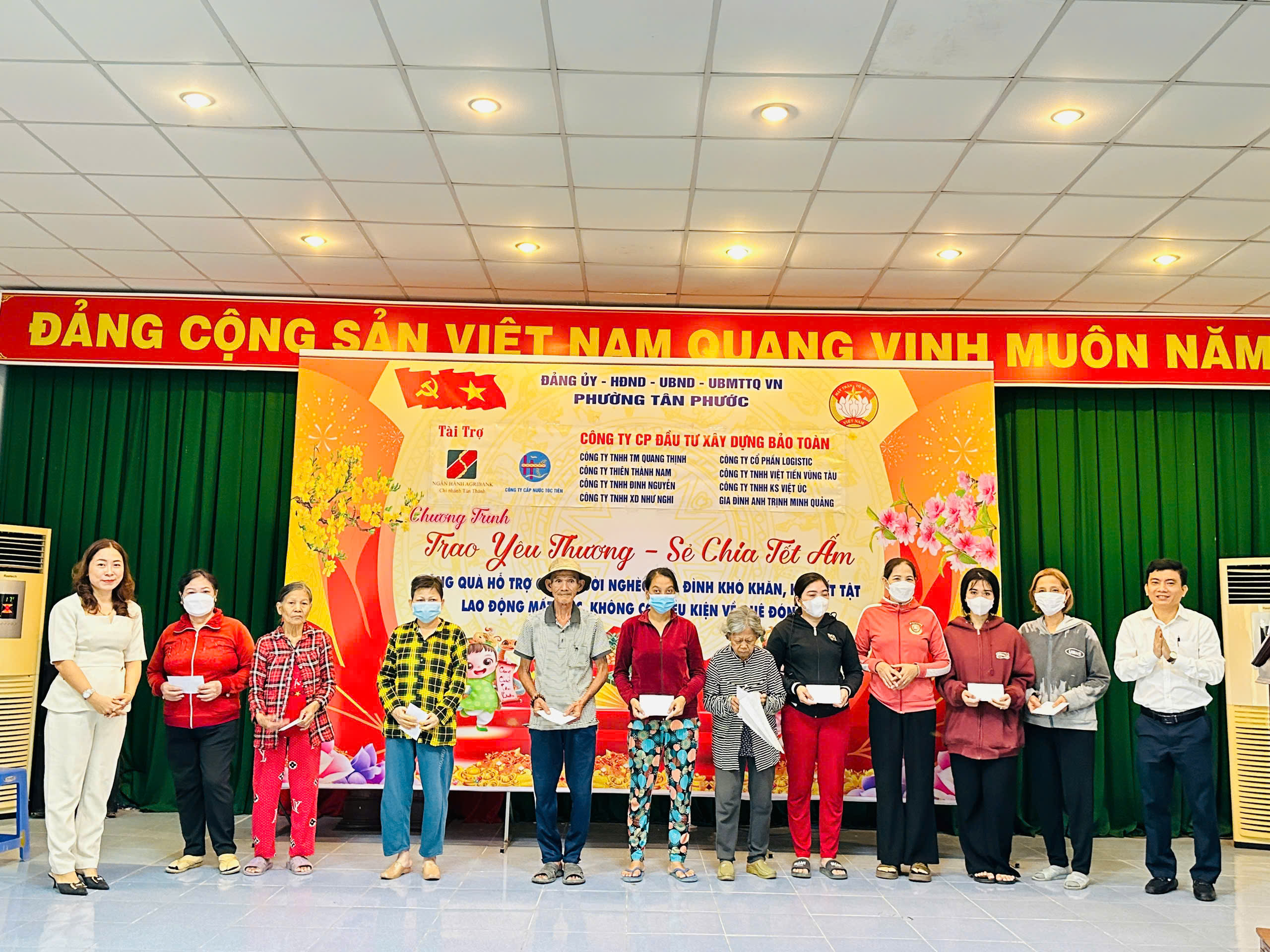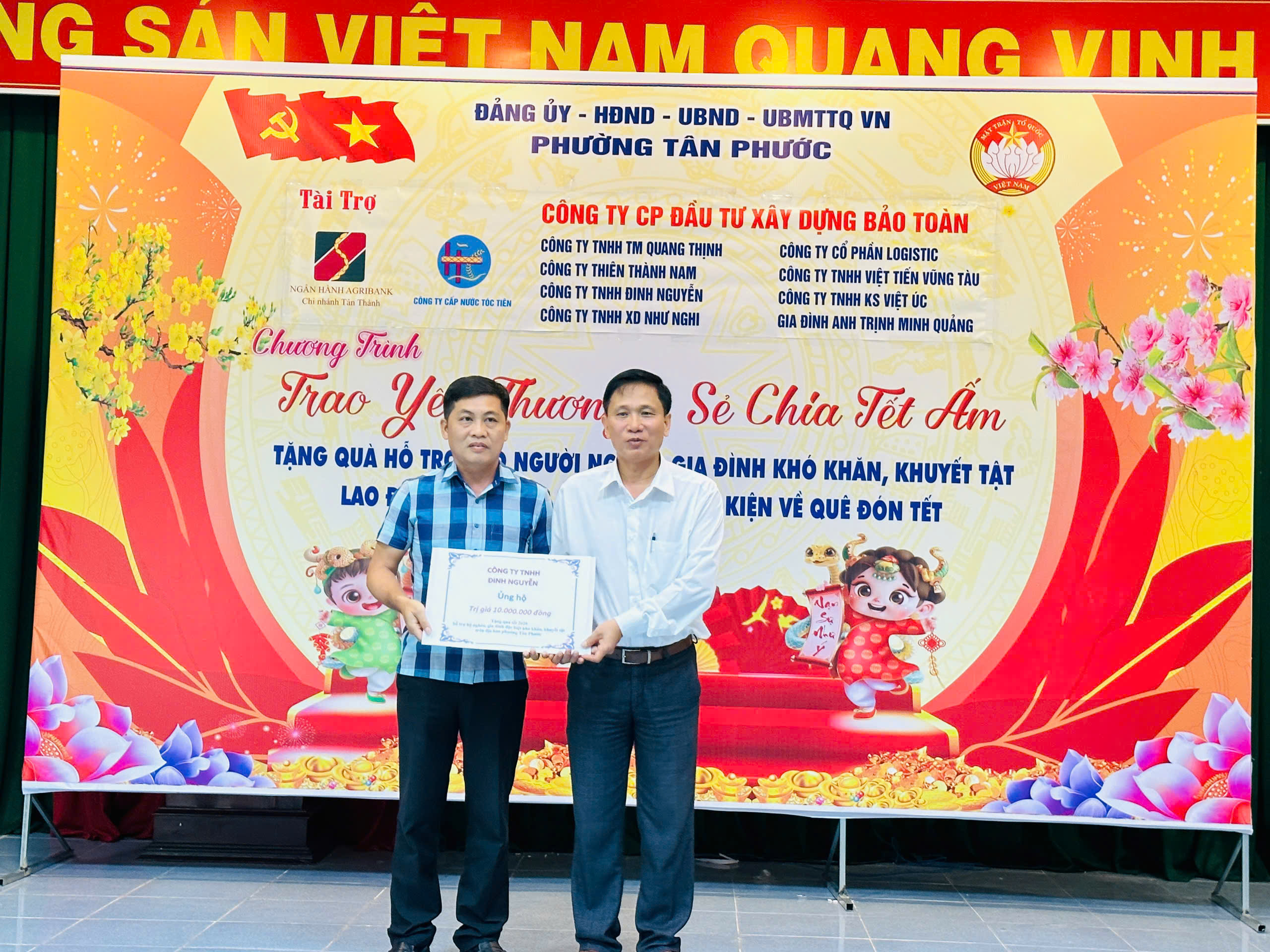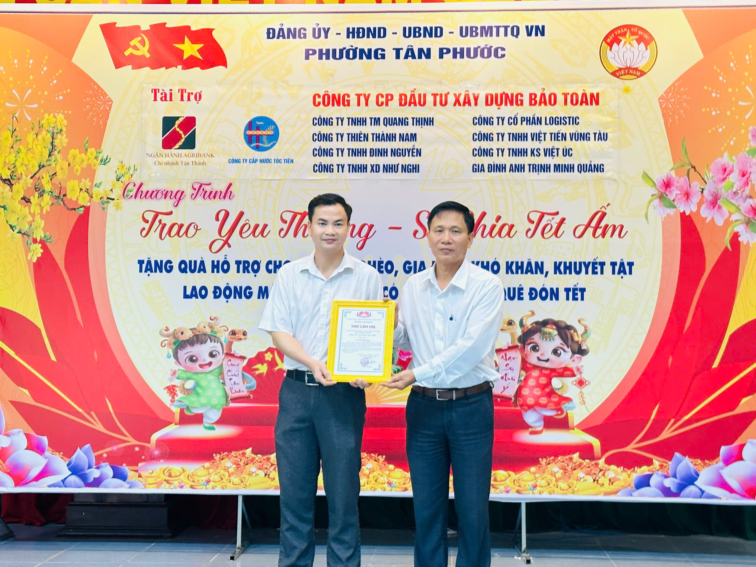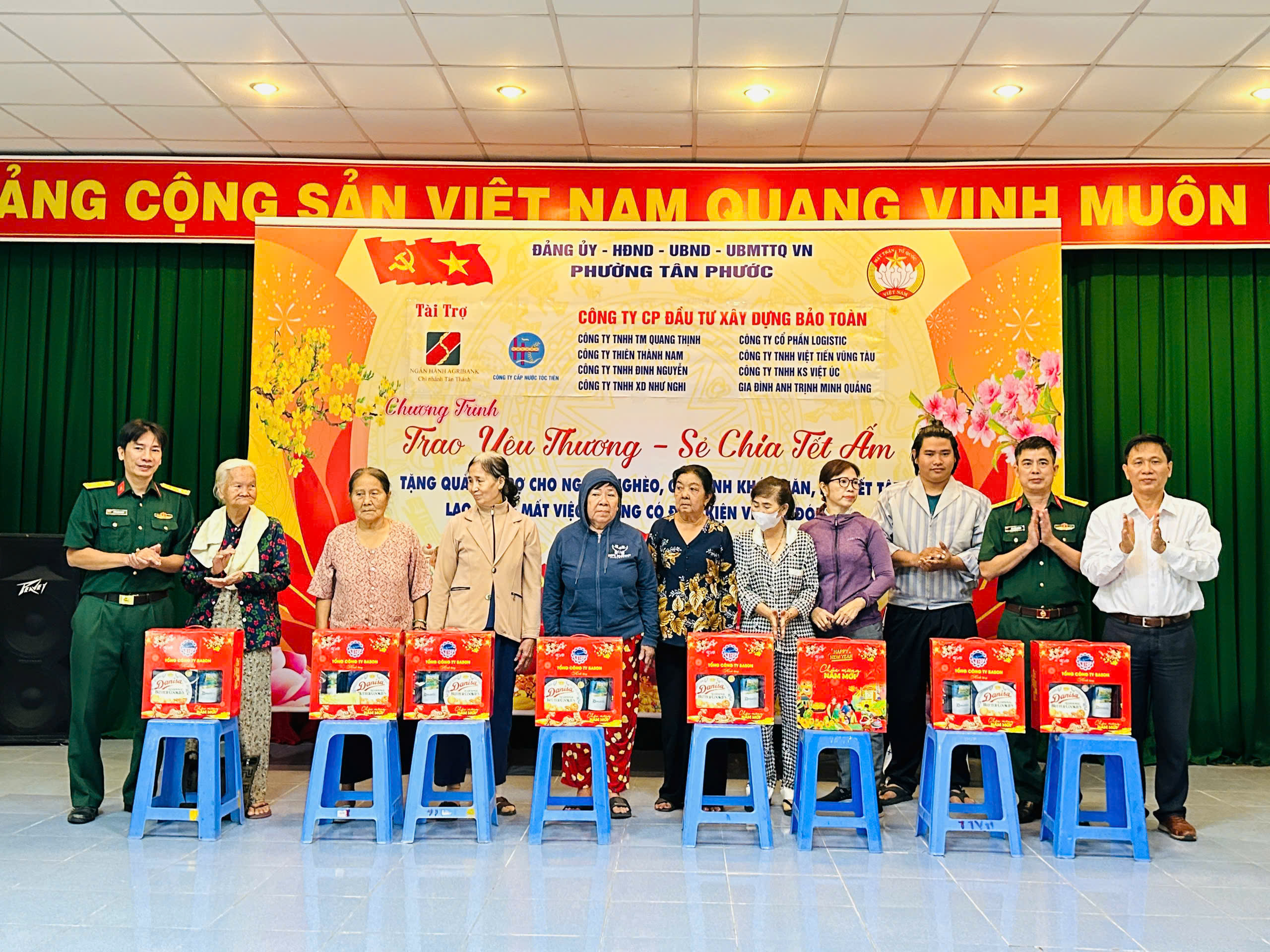 Chương trình “Trao yêu thương – Sẻ chia Tết ấm” của phường Tân Phước chính thức khai mạc từ ngày 16/01 và kéo dài đến hết ngày 25/01/2025. Uỷ ban Mặt trận tổ quốc Việt nam phường Tân Phước xin thay mặt các gia đình nghèo, khó khăn gửi lời tri ân sâu sắc đến Công ty Cổ phần ĐTXD Bảo Toàn, Công ty TNHH Cấp nước Tóc Tiên, Ngân hàng Agribank chi nhánh Phú Mỹ, Công ty TNHH TM Quang Thịnh, Công ty TNHH Thiên Thành Nam, Công ty TNHH Đinh Nguyễn, Công ty TNHH Xây dựng Như Nghi, Công ty Cổ phần Logistic Cái Mép, Công ty TNHH Việt Tiến Vũng Tàu, Công ty TNHH KT khoáng sản Việt Úc, gia đình anh Trịnh Minh Quảng và các mạnh thường quân chung tay hỗ trợ để các gia đình có một mùa xuân ấm cúng đầy nghĩa tình.