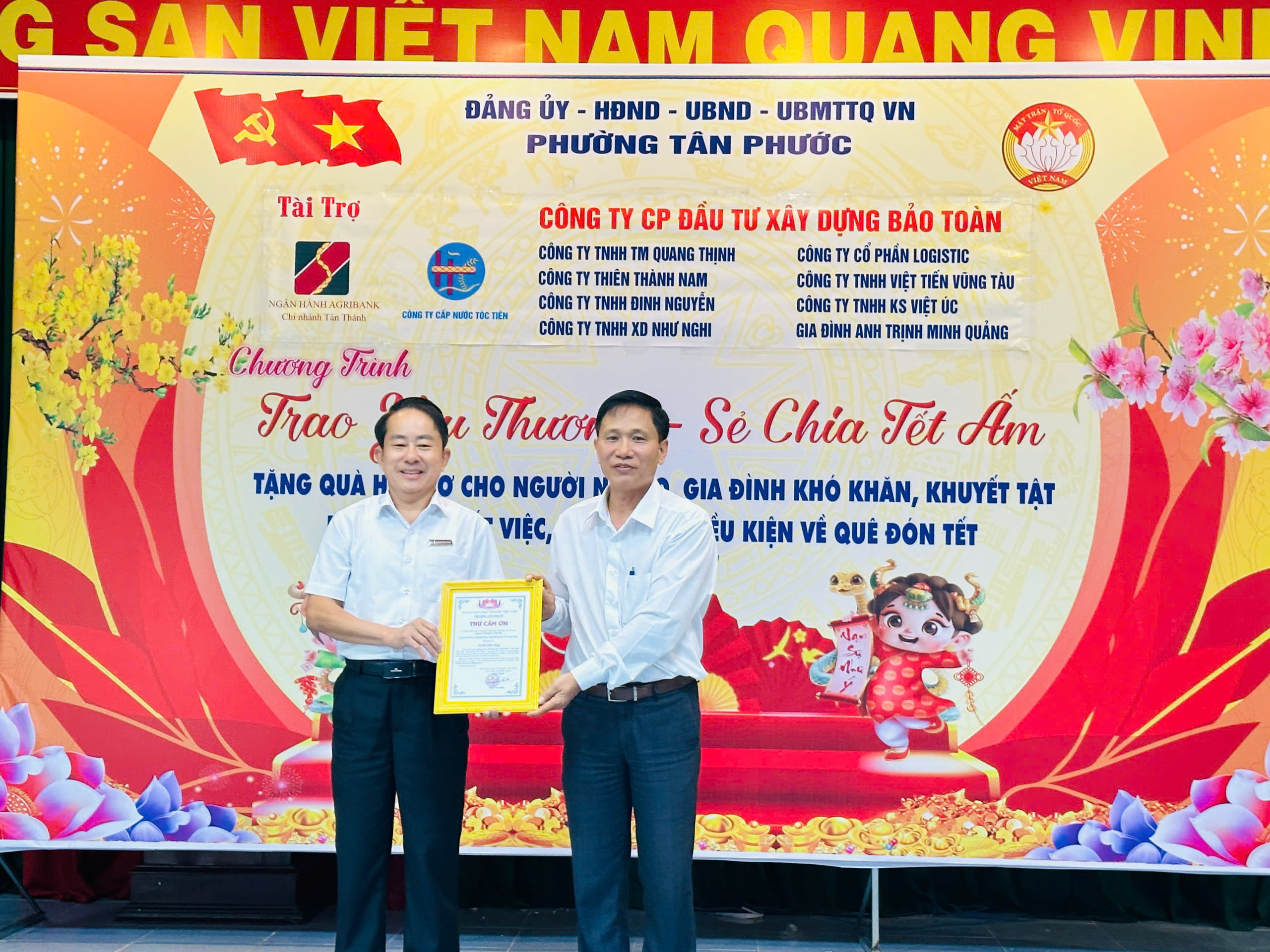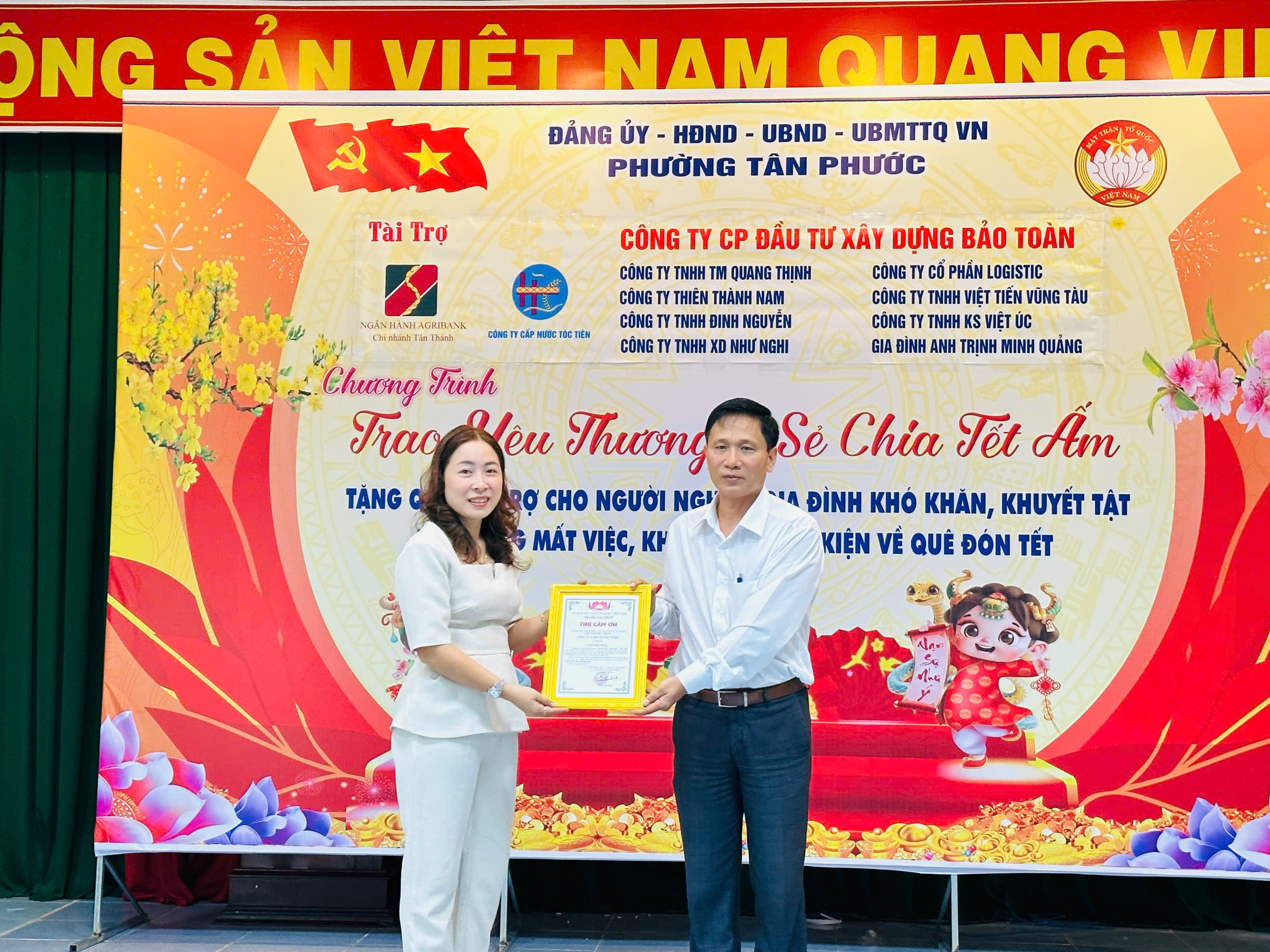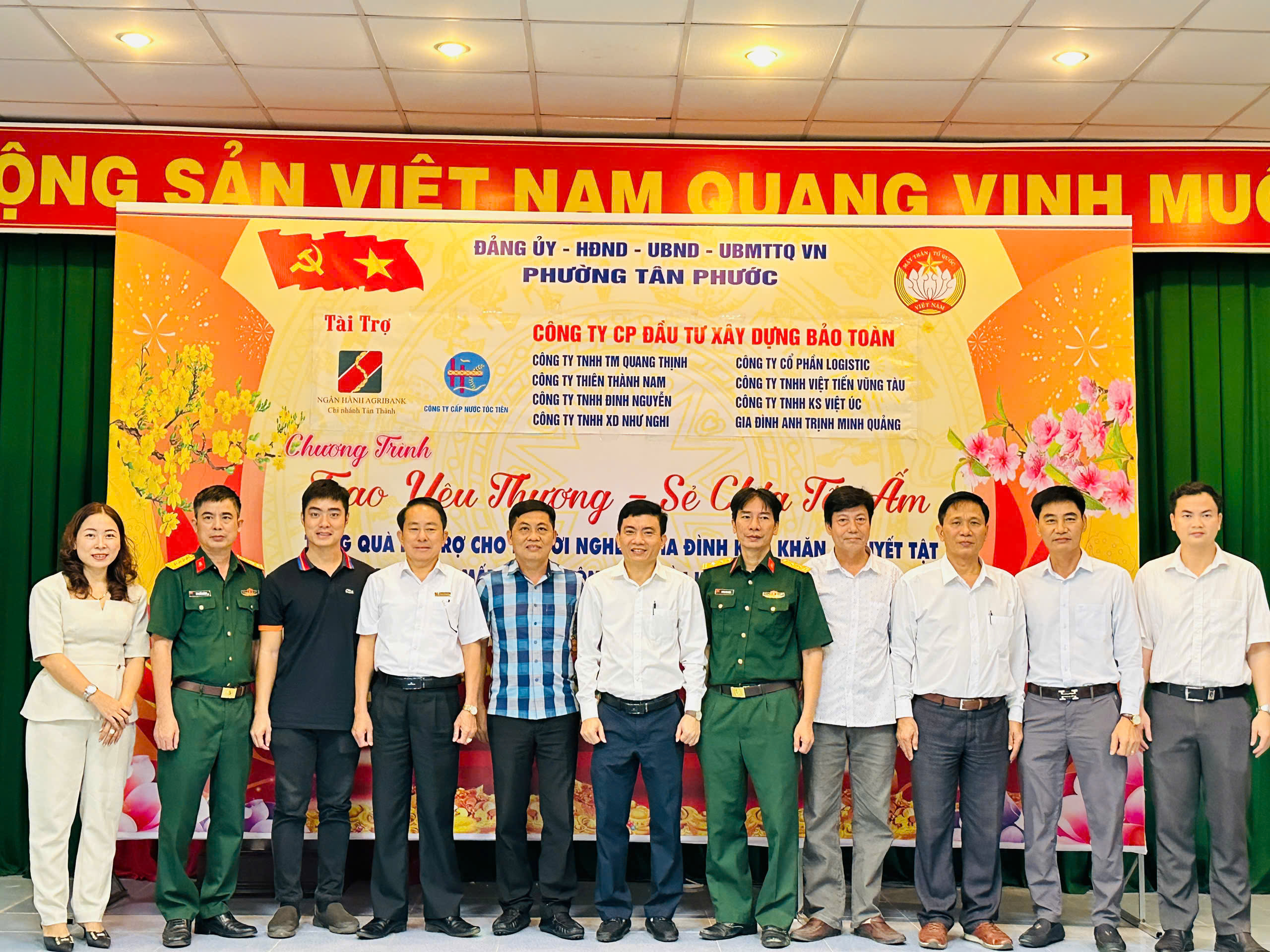 Chương trình “Trao yêu thương – Sẻ chia Tết ấm” của phường Tân Phước chính thức khai mạc từ ngày 16/01 và kéo dài đến hết ngày 25/01/2025. Uỷ ban Mặt trận tổ quốc Việt nam phường Tân Phước xin thay mặt các gia đình nghèo, khó khăn gửi lời tri ân sâu sắc đến Công ty Cổ phần ĐTXD Bảo Toàn, Công ty TNHH Cấp nước Tóc Tiên, Ngân hàng Agribank chi nhánh Phú Mỹ, Công ty TNHH TM Quang Thịnh, Công ty TNHH Thiên Thành Nam, Công ty TNHH Đinh Nguyễn, Công ty TNHH Xây dựng Như Nghi, Công ty Cổ phần Logistic Cái Mép, Công ty TNHH Việt Tiến Vũng Tàu, Công ty TNHH KT khoáng sản Việt Úc, gia đình anh Trịnh Minh Quảng và các mạnh thường quân chung tay hỗ trợ để các gia đình có một mùa xuân ấm cúng đầy nghĩa tình.