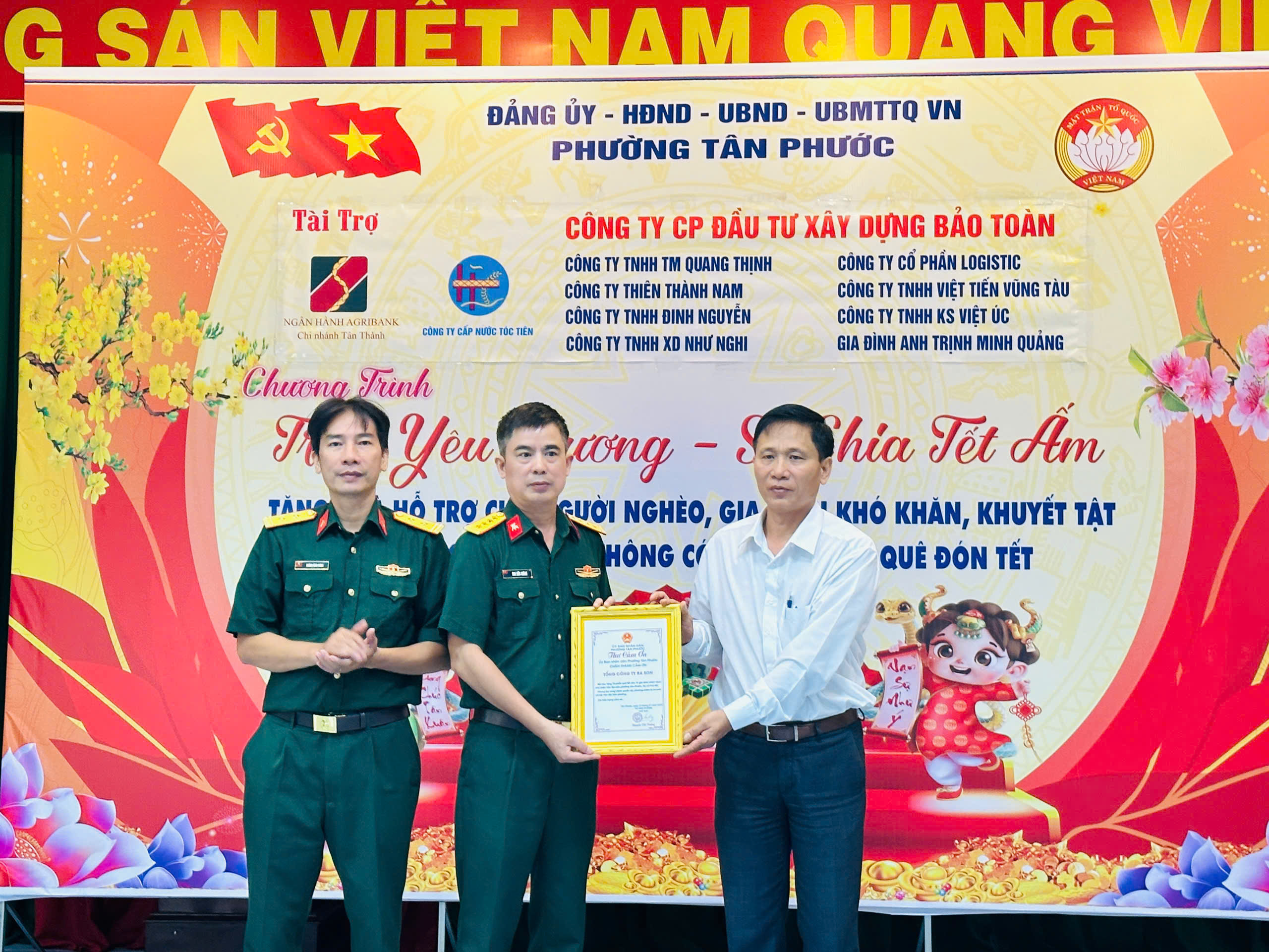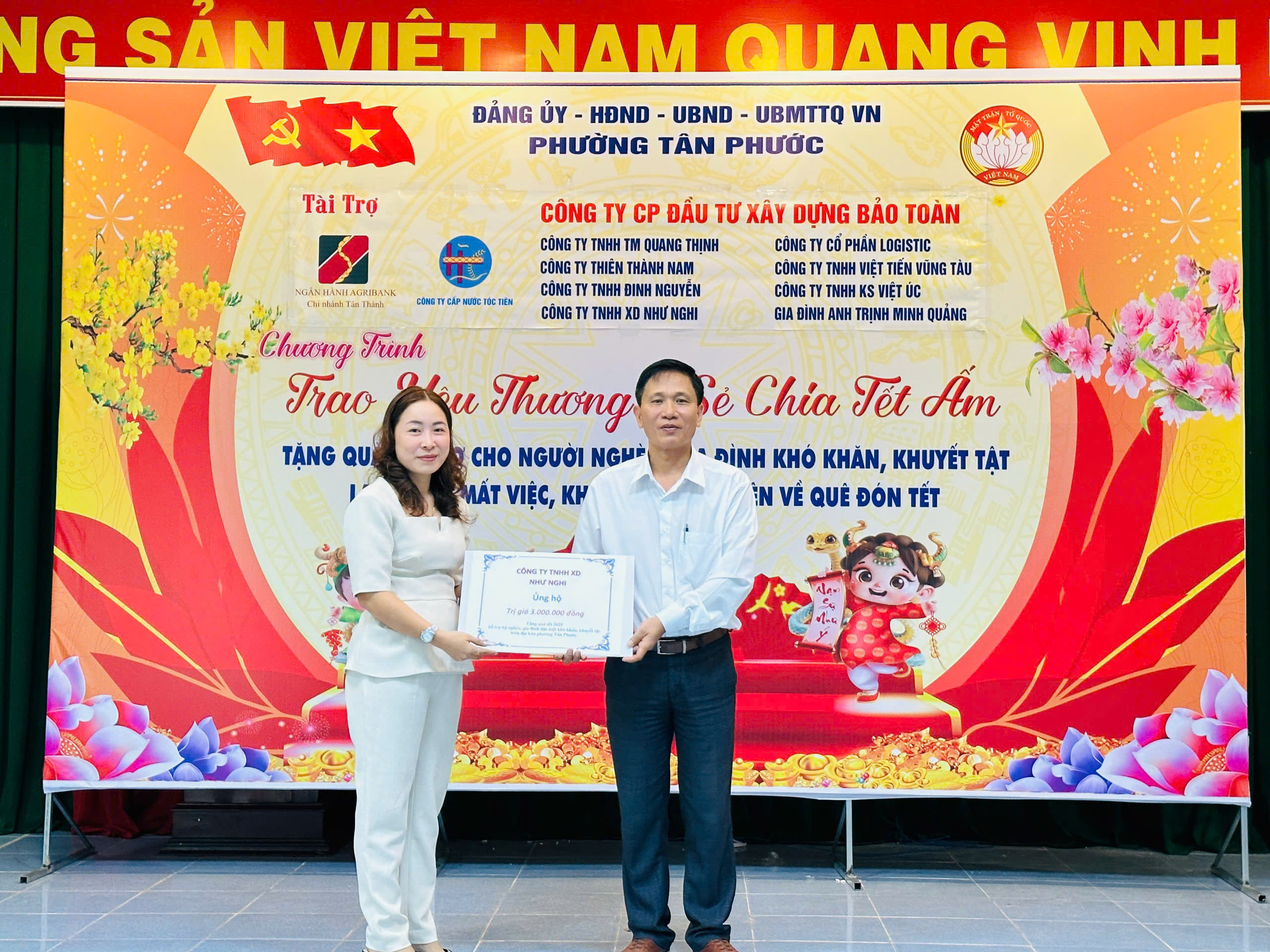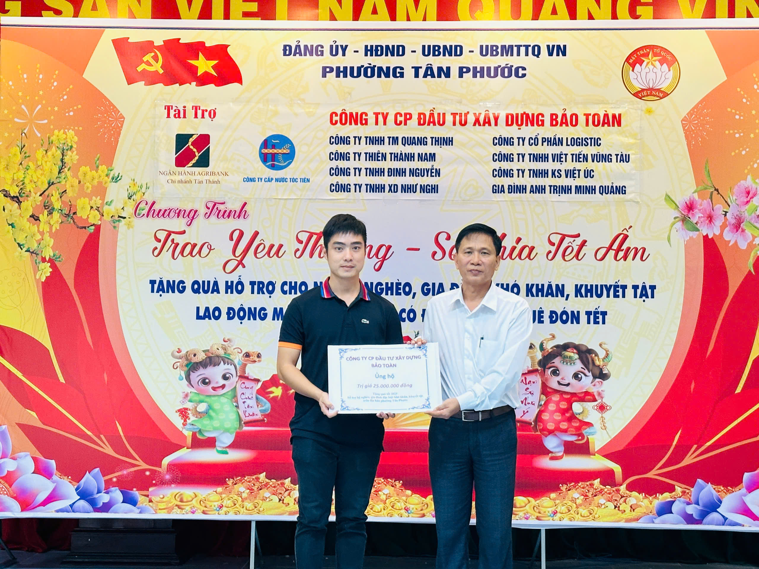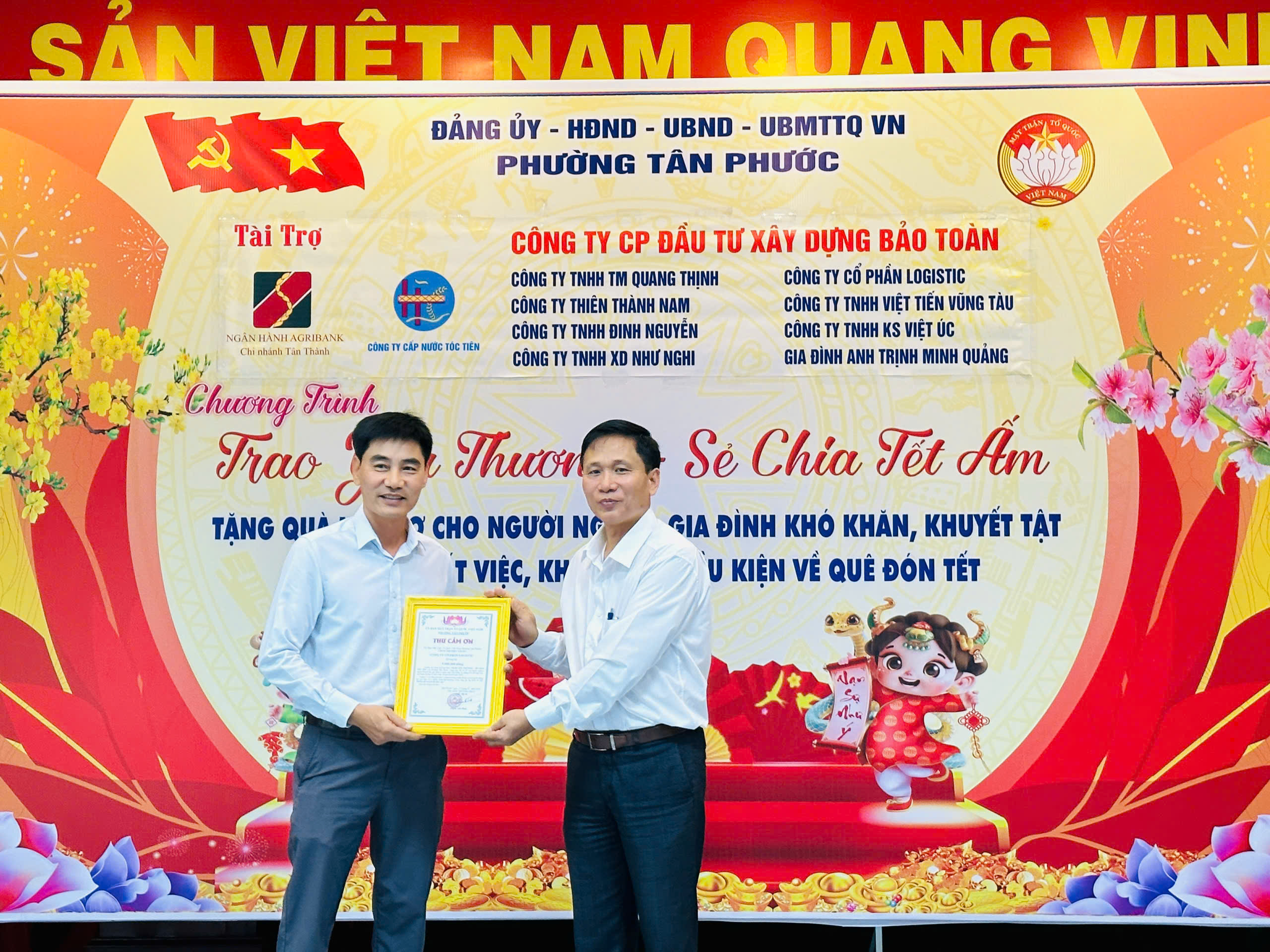 Chương trình “Trao yêu thương – Sẻ chia Tết ấm” của phường Tân Phước chính thức khai mạc từ ngày 16/01 và kéo dài đến hết ngày 25/01/2025. Uỷ ban Mặt trận tổ quốc Việt nam phường Tân Phước xin thay mặt các gia đình nghèo, khó khăn gửi lời tri ân sâu sắc đến Công ty Cổ phần ĐTXD Bảo Toàn, Công ty TNHH Cấp nước Tóc Tiên, Ngân hàng Agribank chi nhánh Phú Mỹ, Công ty TNHH TM Quang Thịnh, Công ty TNHH Thiên Thành Nam, Công ty TNHH Đinh Nguyễn, Công ty TNHH Xây dựng Như Nghi, Công ty Cổ phần Logistic Cái Mép, Công ty TNHH Việt Tiến Vũng Tàu, Công ty TNHH KT khoáng sản Việt Úc, gia đình anh Trịnh Minh Quảng và các mạnh thường quân chung tay hỗ trợ để các gia đình có một mùa xuân ấm cúng đầy nghĩa tình.
