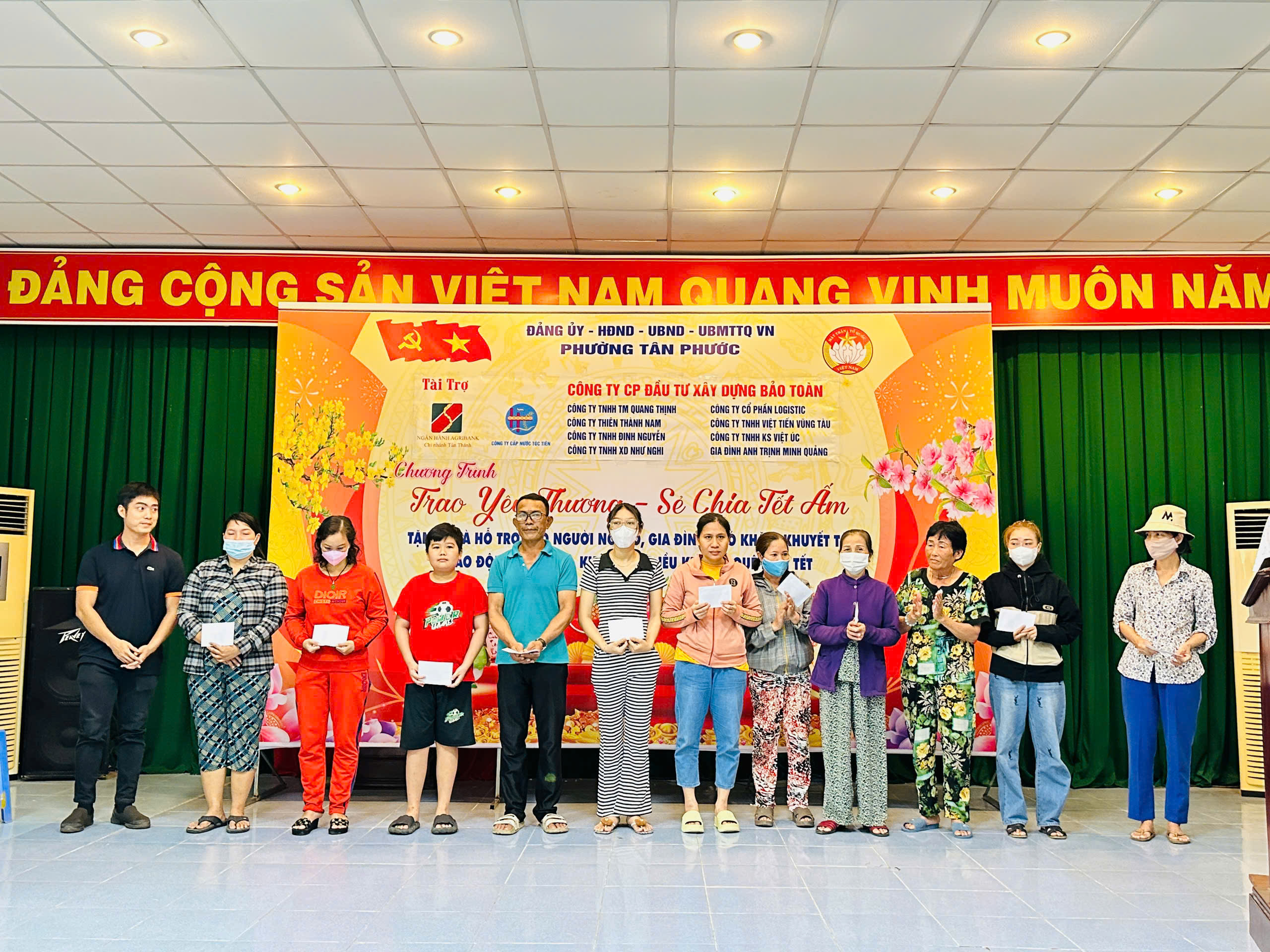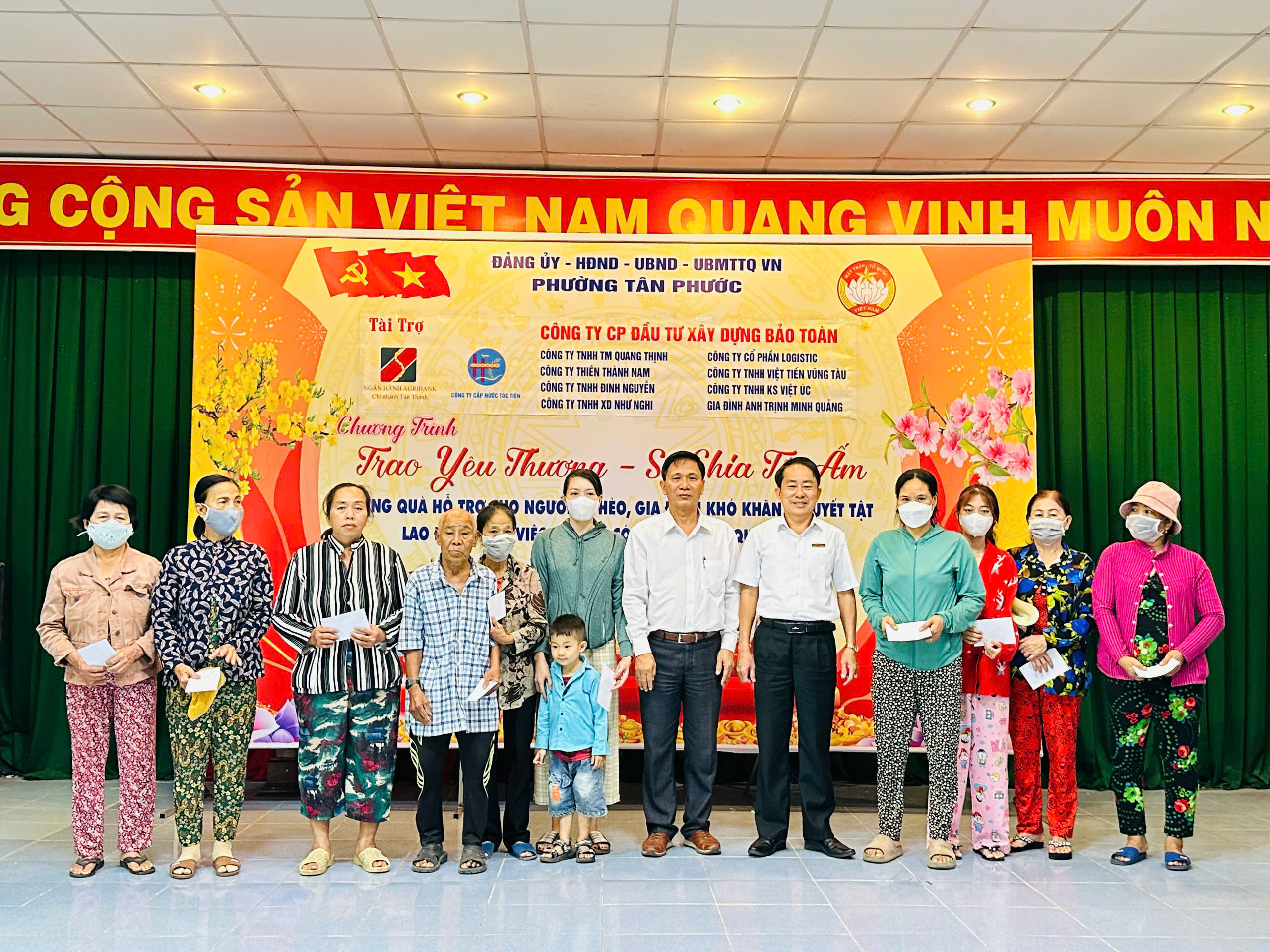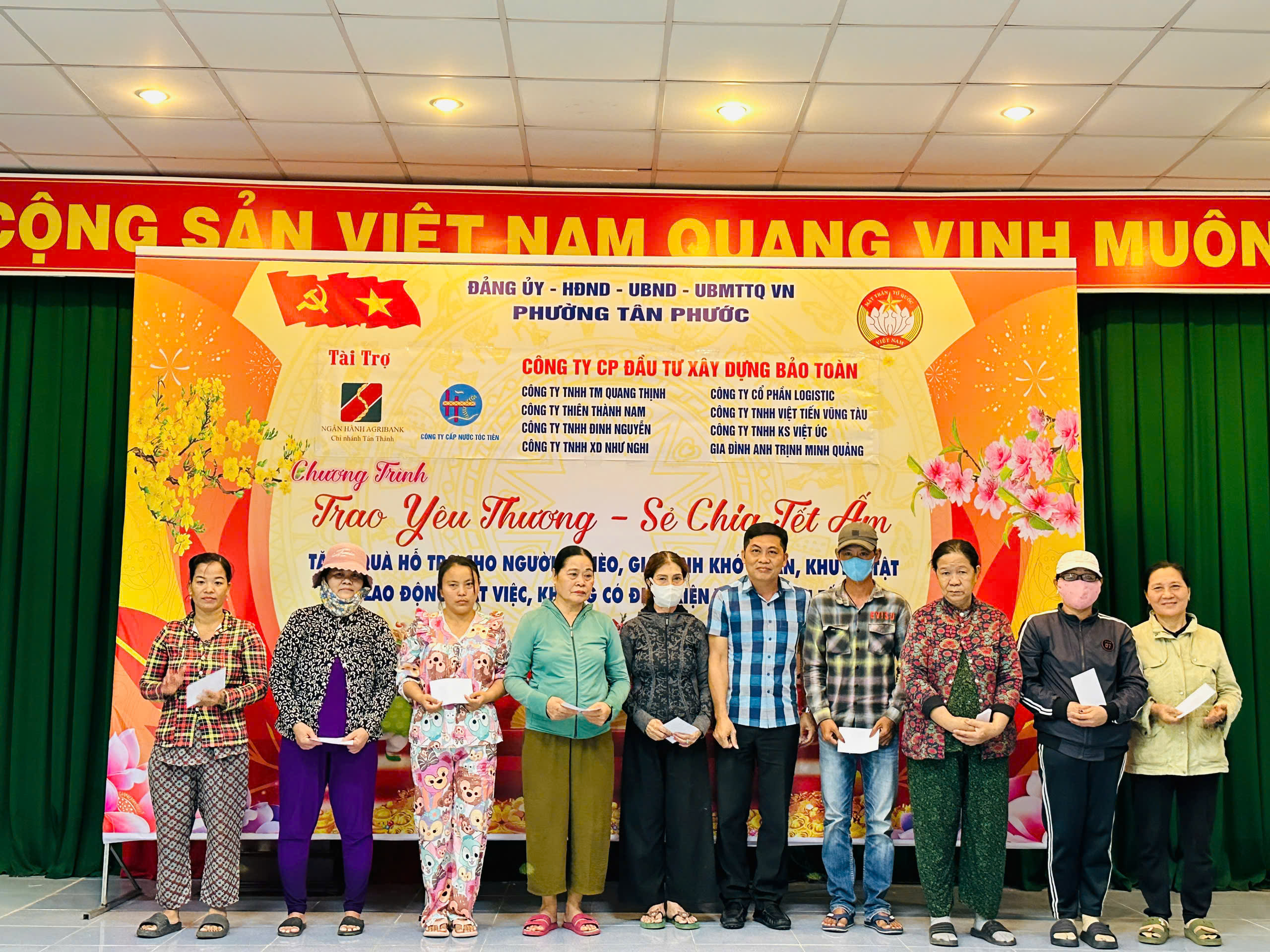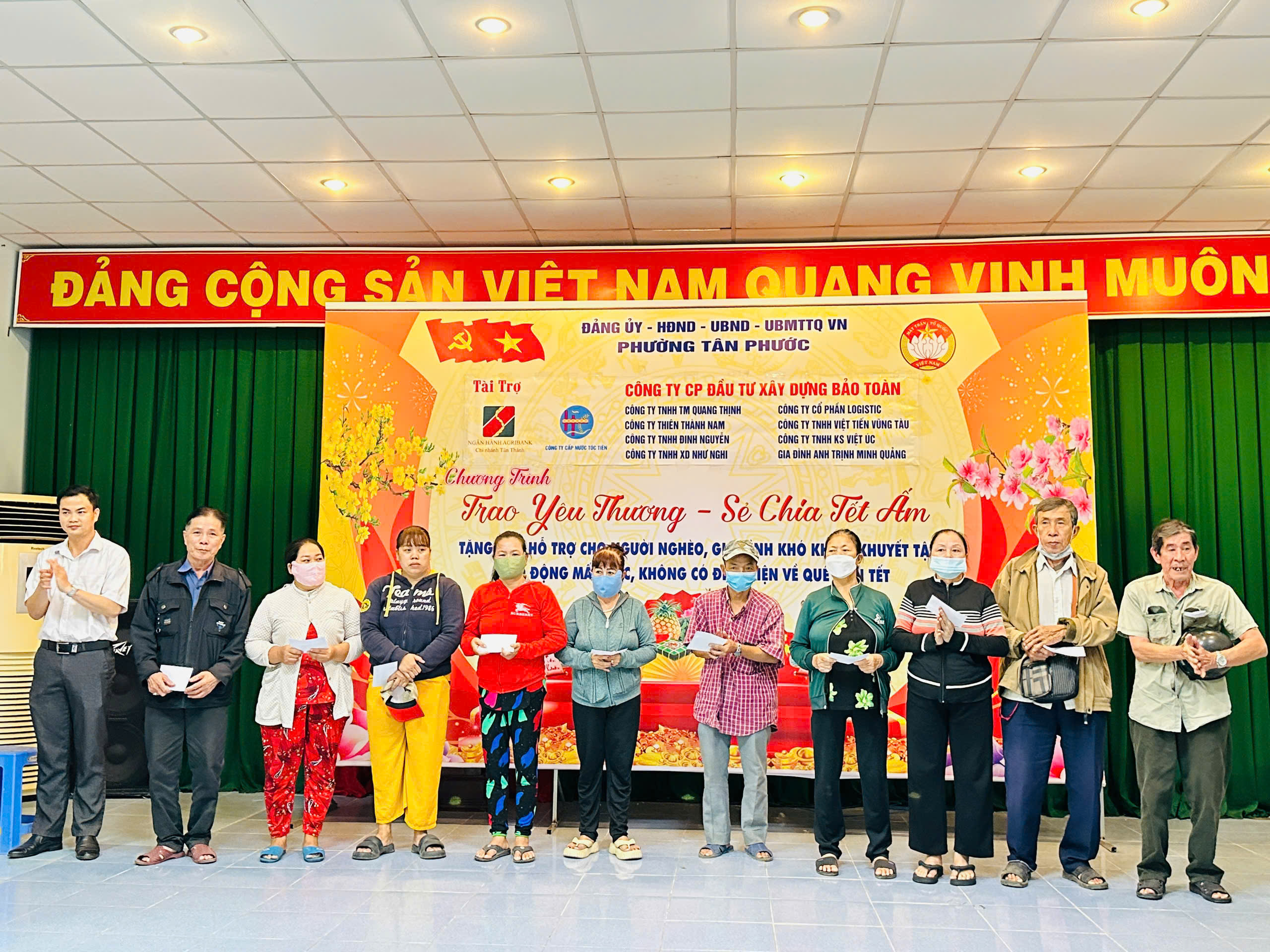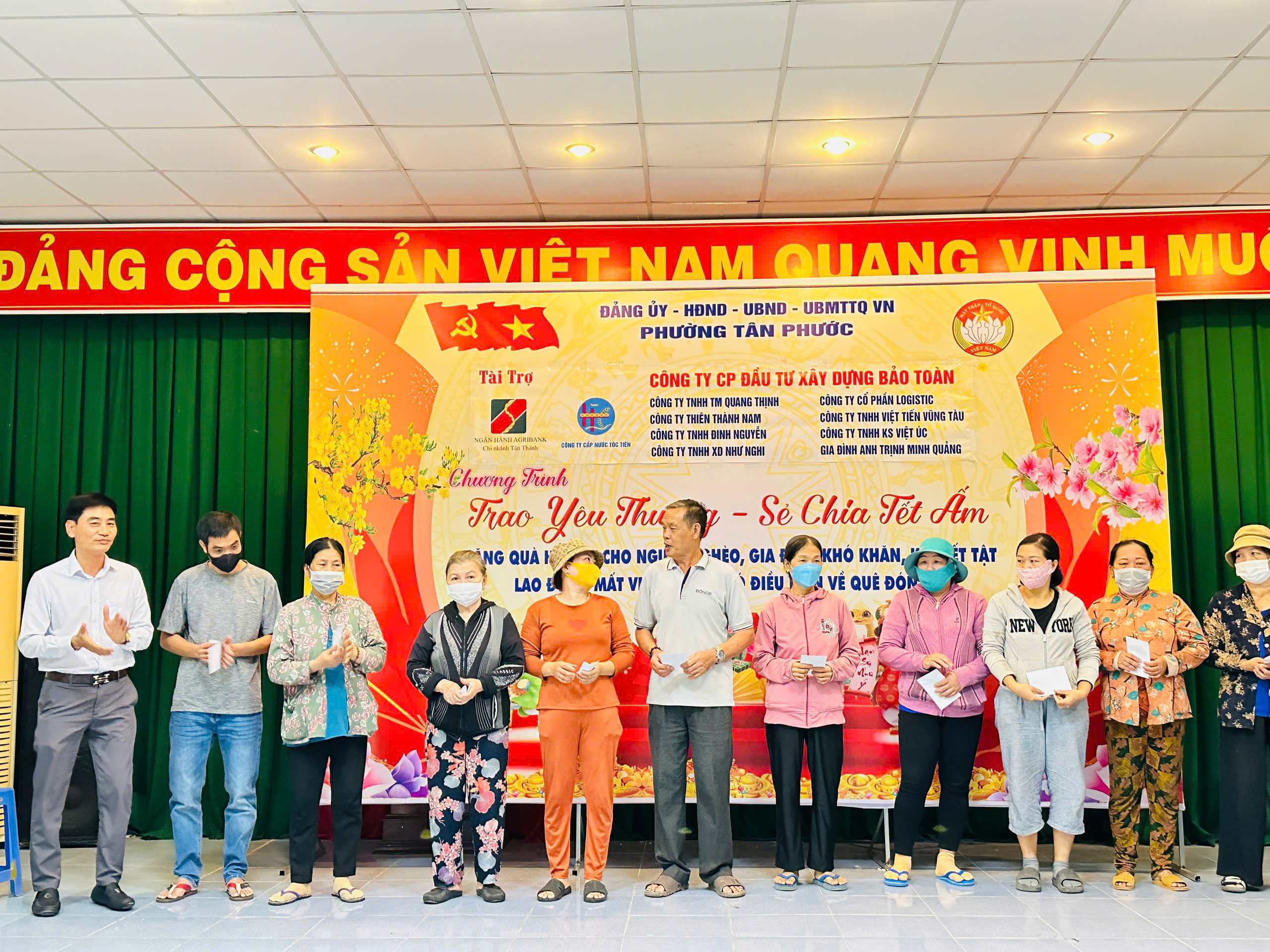 Các hộ dân được lãnh đạo địa phương động viên, chúc tết và trao tặng một suất quà tết trị giá 500.000 đồng, tổng giá trị quà trao tặng là 70 triệu đồng từ nguồn vận động ủng hộ của Công ty Cổ phần ĐTXD Bảo Toàn, Công ty TNHH Cấp nước Tóc Tiên, Ngân hàng Agribank chi nhánh Phú Mỹ, Công ty TNHH TM Quang Thịnh, Công ty TNHH Thiên Thành Nam, Công ty TNHH Đinh Nguyễn, Công ty TNHH Xây dựng Như Nghi, Công ty Cổ phần Logistic Cái Mép, Công ty TNHH Việt Tiến Vũng Tàu, Công ty TNHH KT khoáng sản Việt Úc, gia đình anh Trịnh Minh Quảng chung tay hỗ trợ.