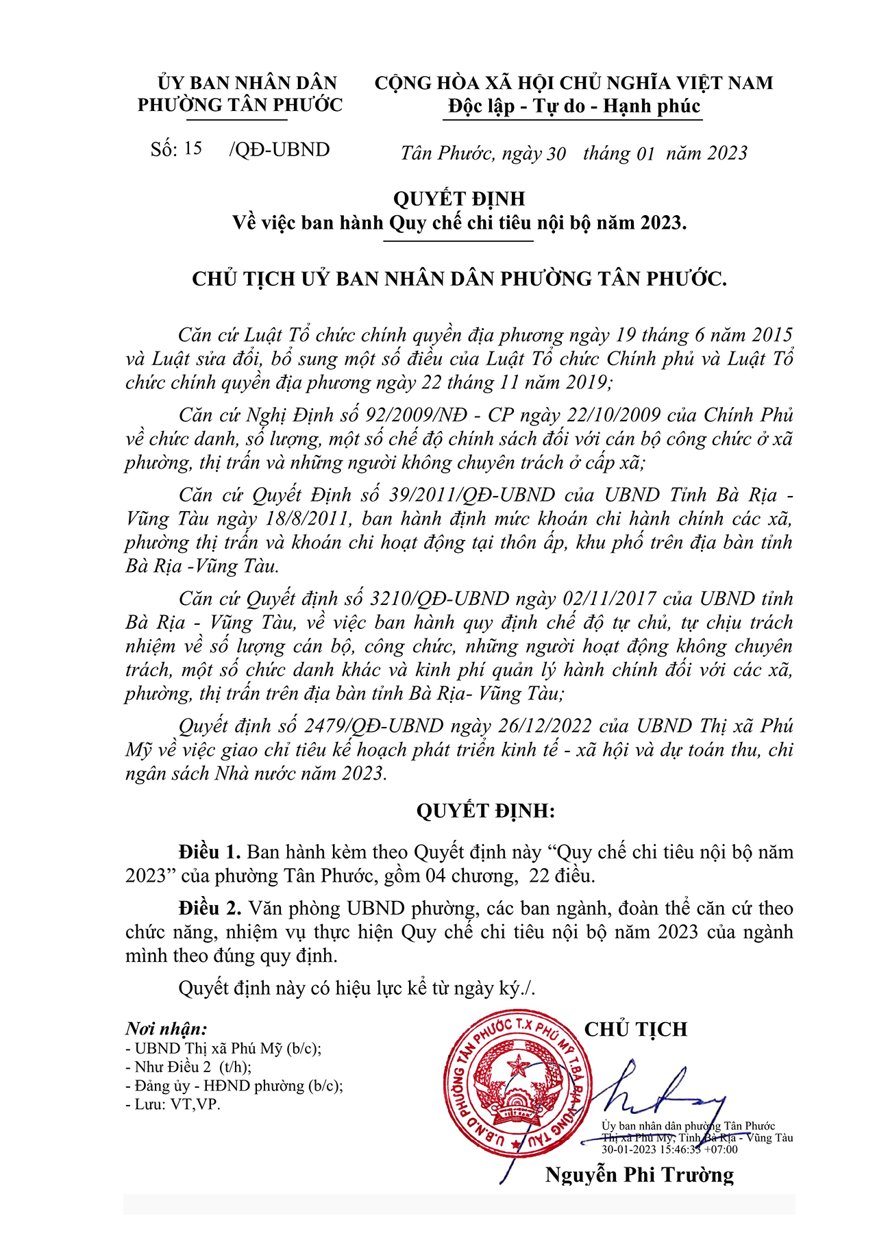 TIN TỨC SỰ KIỆN Phi Trường | 30/01/202306/12/2023 | 10:13 Quy chế chi tiêu nội bộ năm 2023 UBND phường Tân Phước quyết định ban hành Quy chế chi tiêu nội bộ năm 2023: 5/5 - (1 đánh giá) Công cố công khai thu nhập cá nhân của CBCC phường Tân Phước năm 2022 Phường Tân Phước, thị xã Phú Mỹ sẵn sàng cho ngày hội tòng quân 2023