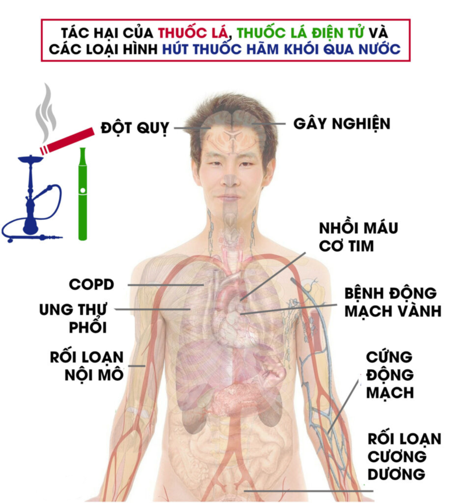 Hút thuốc lá có thể gây ung thư với mọi cơ quan trong cơ thể của bạn: phổi, bàng quang, máu, cổ tử cung, đại tràng, thực quản, thận, vòm họng, gan, tụy, dạ dày. Hút thuốc cũng gây ra: Bệnh tim mạch, đột quỵ, bệnh phổi như khí phế thũng và viêm phế quản.