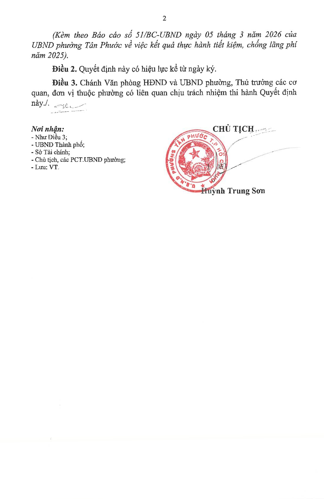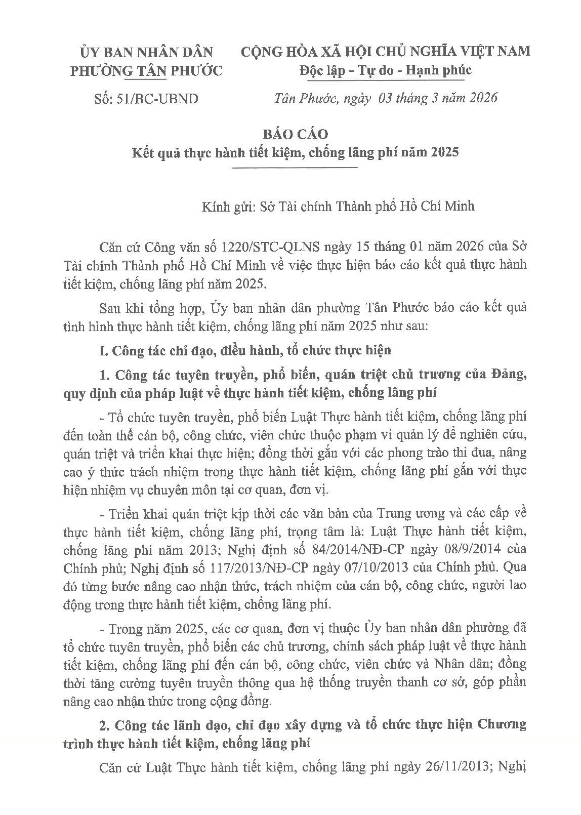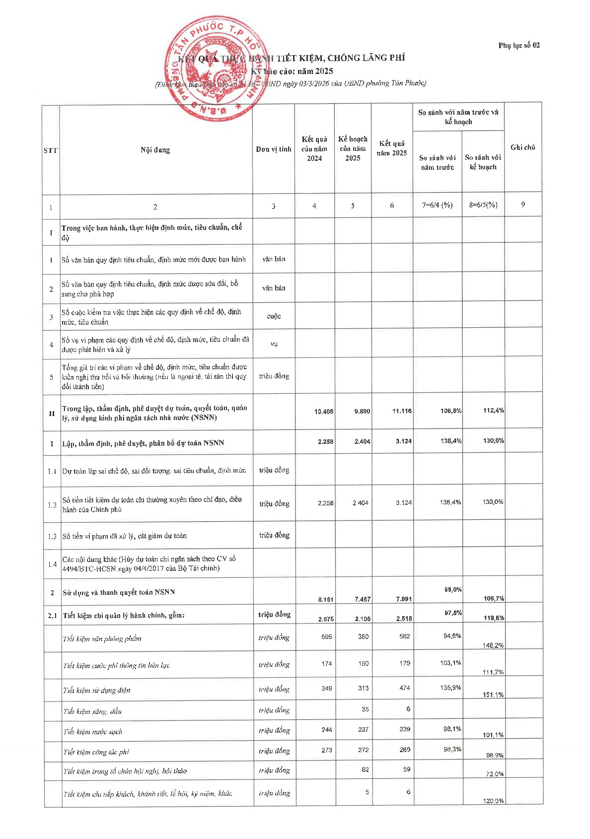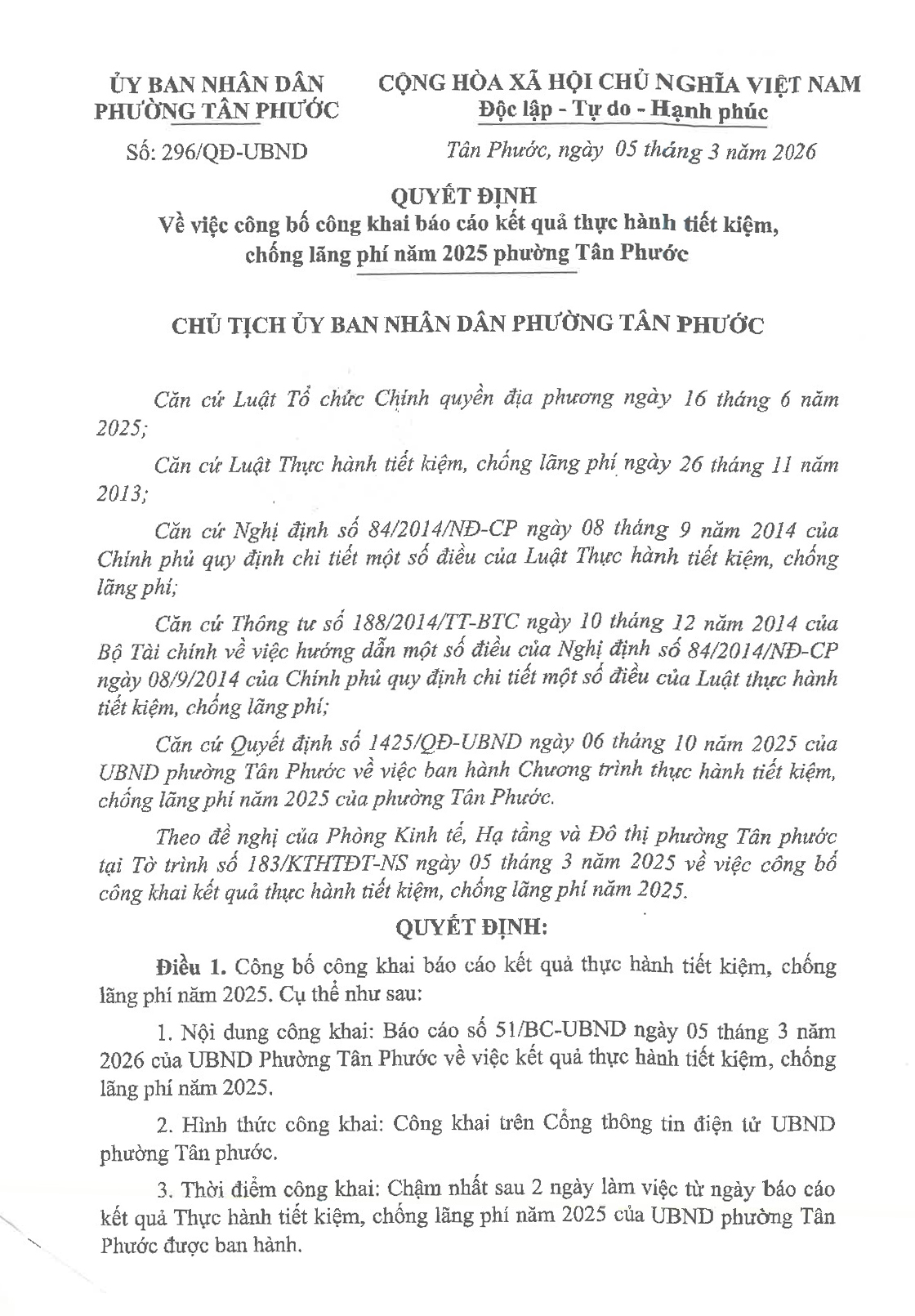 UBND phường Tân Phước công bố công khai báo cáo kết quả thực hành tiết kiệm, phòng chống lãng phí năm 2025 tại Quyết định số 296/QĐ-UBND ngày 05/3/2026.