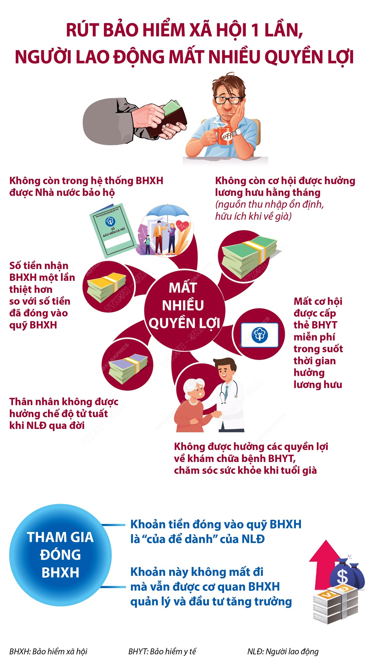 Khi lựa chọn hưởng bảo hiểm xã hội một lần, các quyền lợi của người lao động sẽ bị hạn chế hơn rất nhiều so với hưởng lương hưu. Đó là: người lao động không còn trong hệ thống bảo hiểm xã hội được Nhà nước bảo hộ, mất cơ hội được hưởng lương hưu hằng tháng mất đi cơ hội được cấp thẻ bảo hiểm y tế miễn phí trong suốt thời gian hưởng lương hưu để hưởng các quyền lợi về khám chữa bệnh bảo hiểm y tế, chăm sóc sức khỏe khi tuổi già số tiền nhận về thấp hơn so với số tiền đã đóng vào quỹ bảo hiểm xã hội…