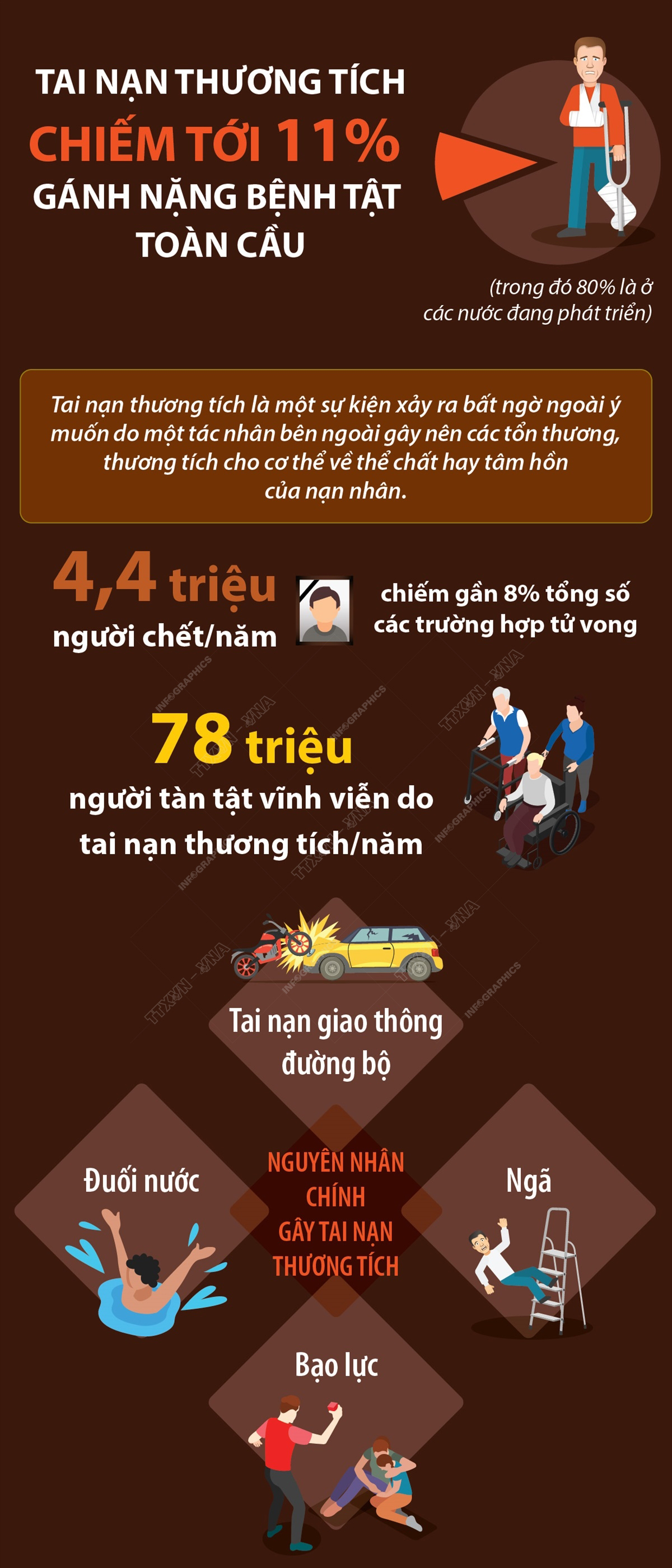 Theo Tổ chức Y tế thế giới (WHO), tai nạn thương tích chiếm tới 11% gánh nặng bệnh tật toàn cầu, trong đó 80% là ở các nước đang phát triển. Mỗi năm có 4,4 triệu người chết (chiếm gần 8% tổng số các trường hợp tử vong) và 78 triệu người tàn tật vĩnh viễn do tai nạn thương tích.