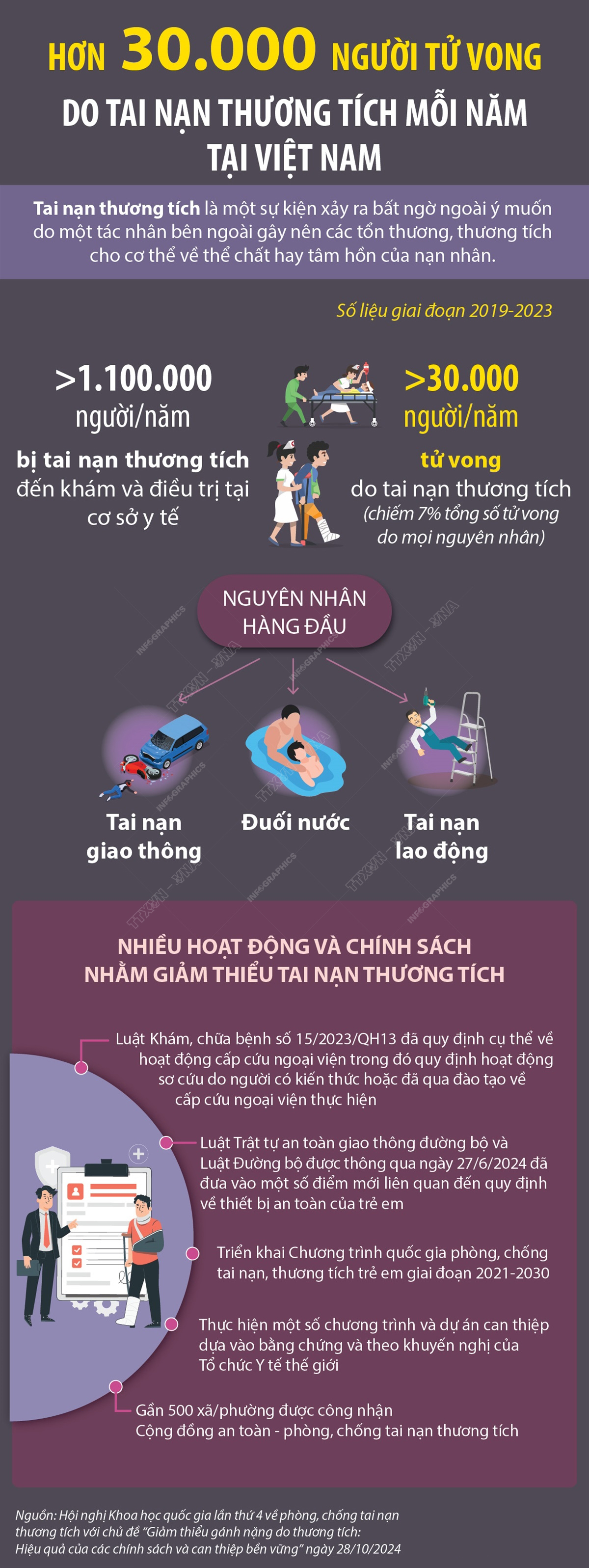 Tai nạn thương tích là một sự kiện xảy ra bất ngờ ngoài ý muốn do một tác nhân bên ngoài gây nên các tổn thương, thương tích cho cơ thể về thể chất hay tâm hồn của nạn nhân. Tại Việt Nam, trong giai đoạn 2019-2023, trung bình mỗi năm có khoảng hơn 1,1 triệu trường hợp mắc tai nạn thương tích đến khám và điều trị tại cơ sở y tế và hơn 30.000 người tử vong do tai nạn thương tích. Tai nạn thương tích không chỉ gây ra những mất mát to lớn về sinh mạng mà còn tạo ra gánh nặng kinh tế và xã hội đáng kể.