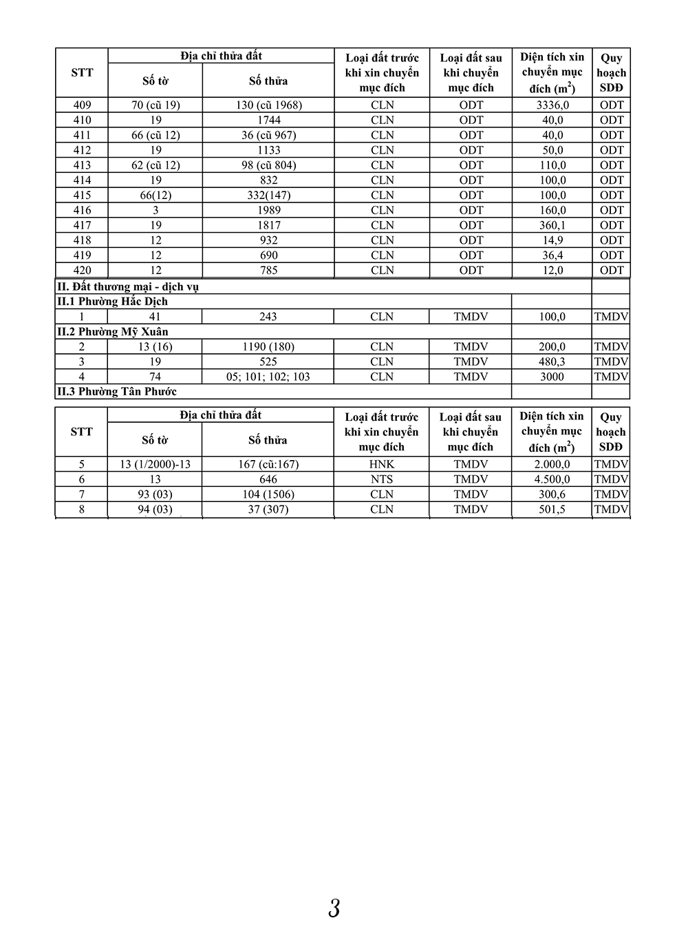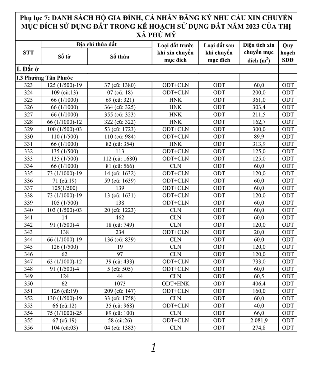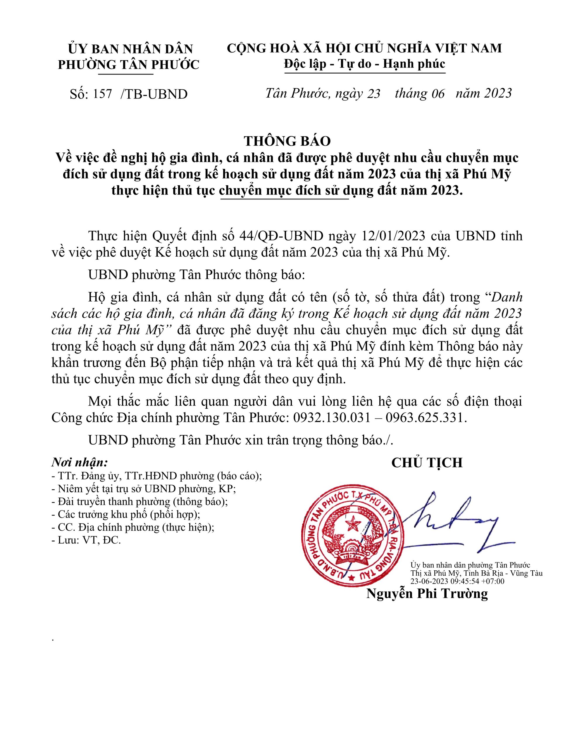 Hộ gia đình, cá nhân sử dụng đất có tên (số tờ, số thửa đất) trong “Danh sách các hộ gia đình, cá nhân đã đăng ký trong Kế hoạch sử dụng đất năm 2023 của thị xã Phú Mỹ” đã được phê duyệt nhu cầu chuyển mục đích sử dụng đất trong kế hoạch sử dụng đất năm 2023 của thị xã Phú Mỹ đính kèm Thông báo này khẩn trương đến Bộ phận tiếp nhận và trả kết quả thị xã Phú Mỹ để thực hiện các thủ tục chuyển mục đích sử dụng đất theo quy định.