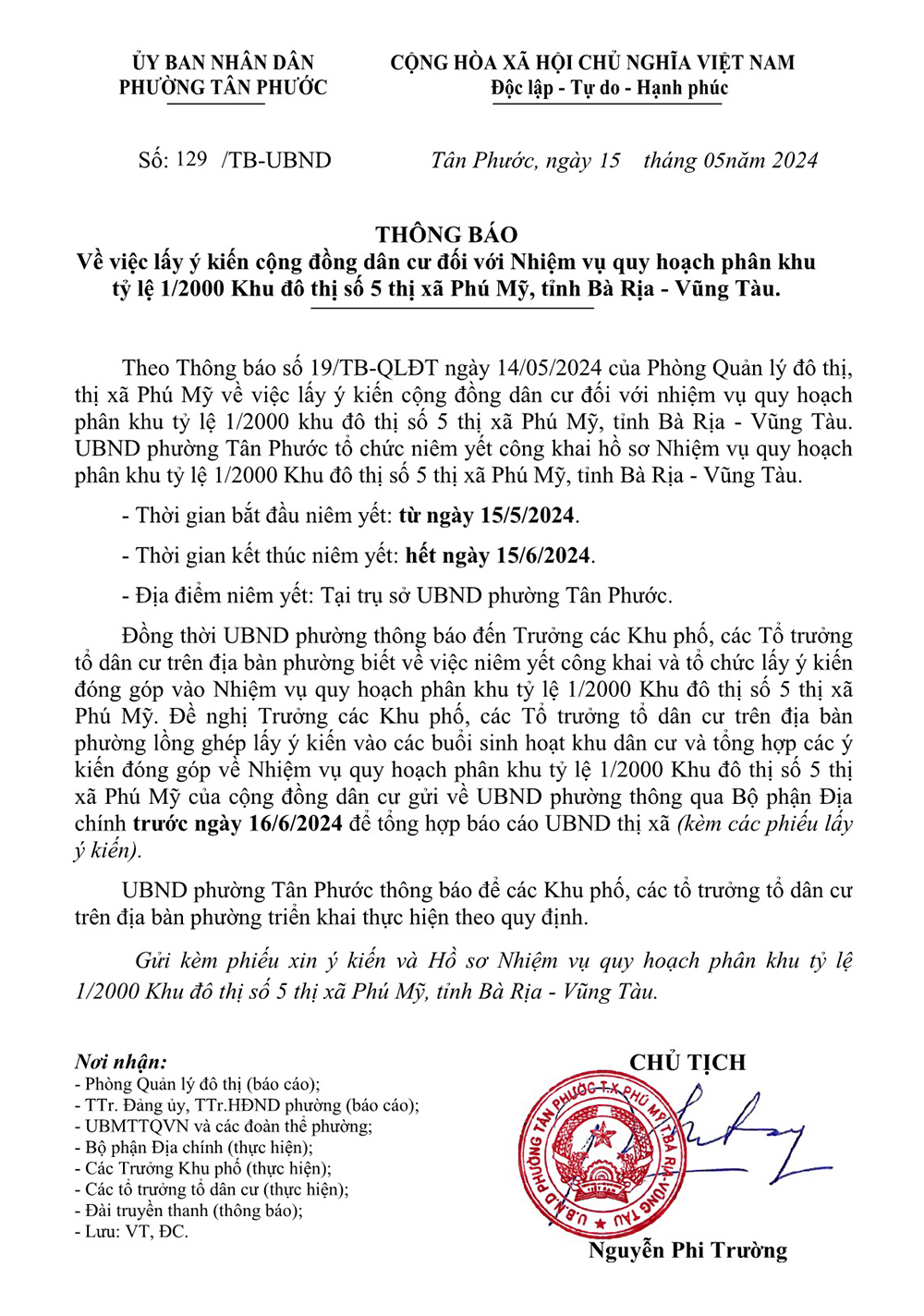 UBND phường Tân Phước thông báo lấy ý kiến cộng đồng dân cư đối với nhiệm vụ quy hoạch phân khu tỷ lệ 1/2000 Khu đô thị số 1, 5 thị xã Phú Mỹ, tỉnh Bà Rịa – Vũng Tàu.