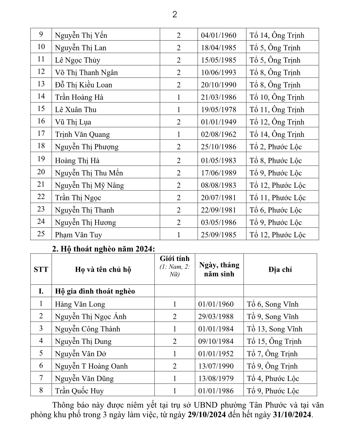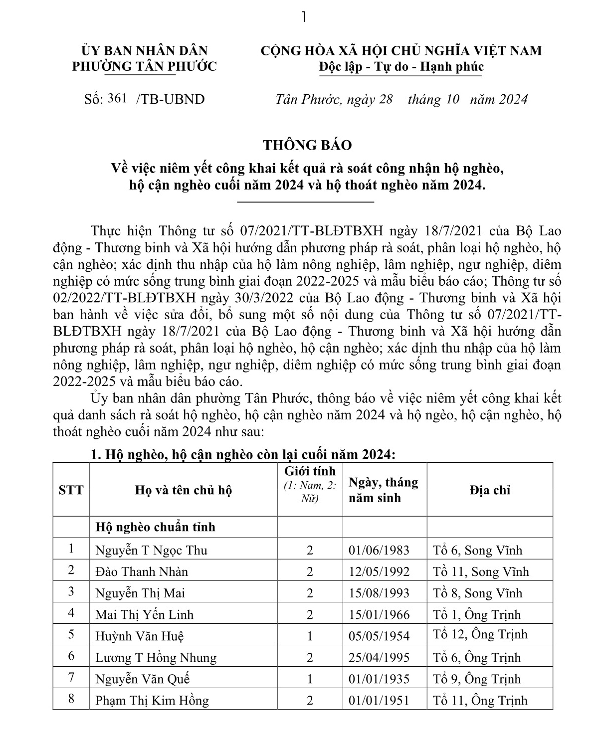 UBND phường Tân Phước thông báo niêm yết công khai kết quả rà soát công nhận hộ nghèo, hộ cận nghèo cuối năm 2024 và hộ thoát nghèo cuối năm 2024: