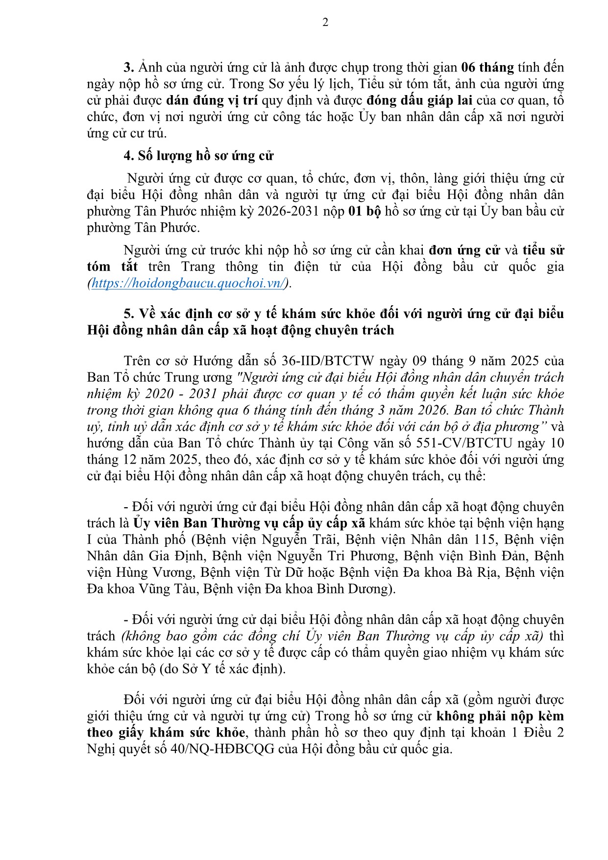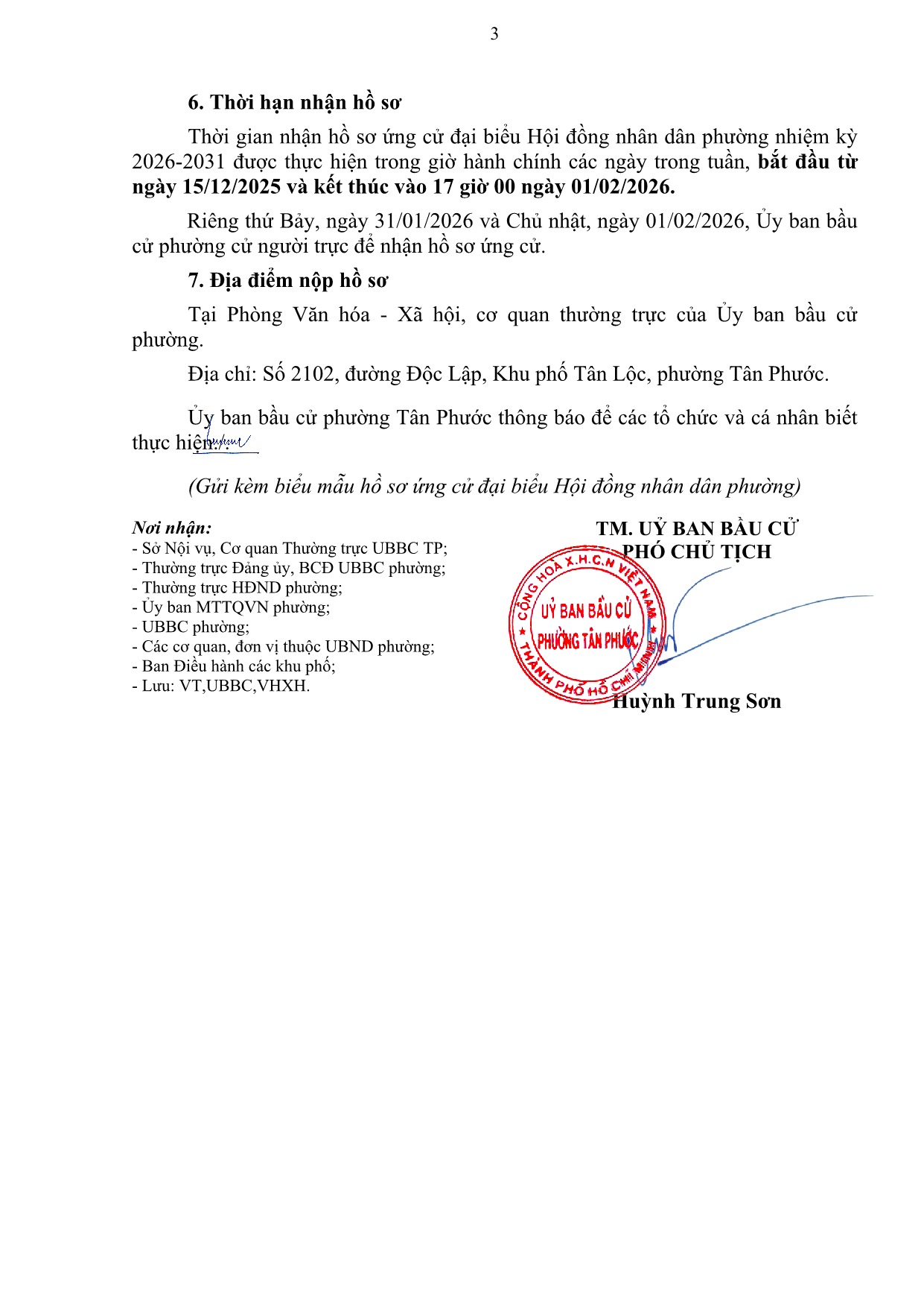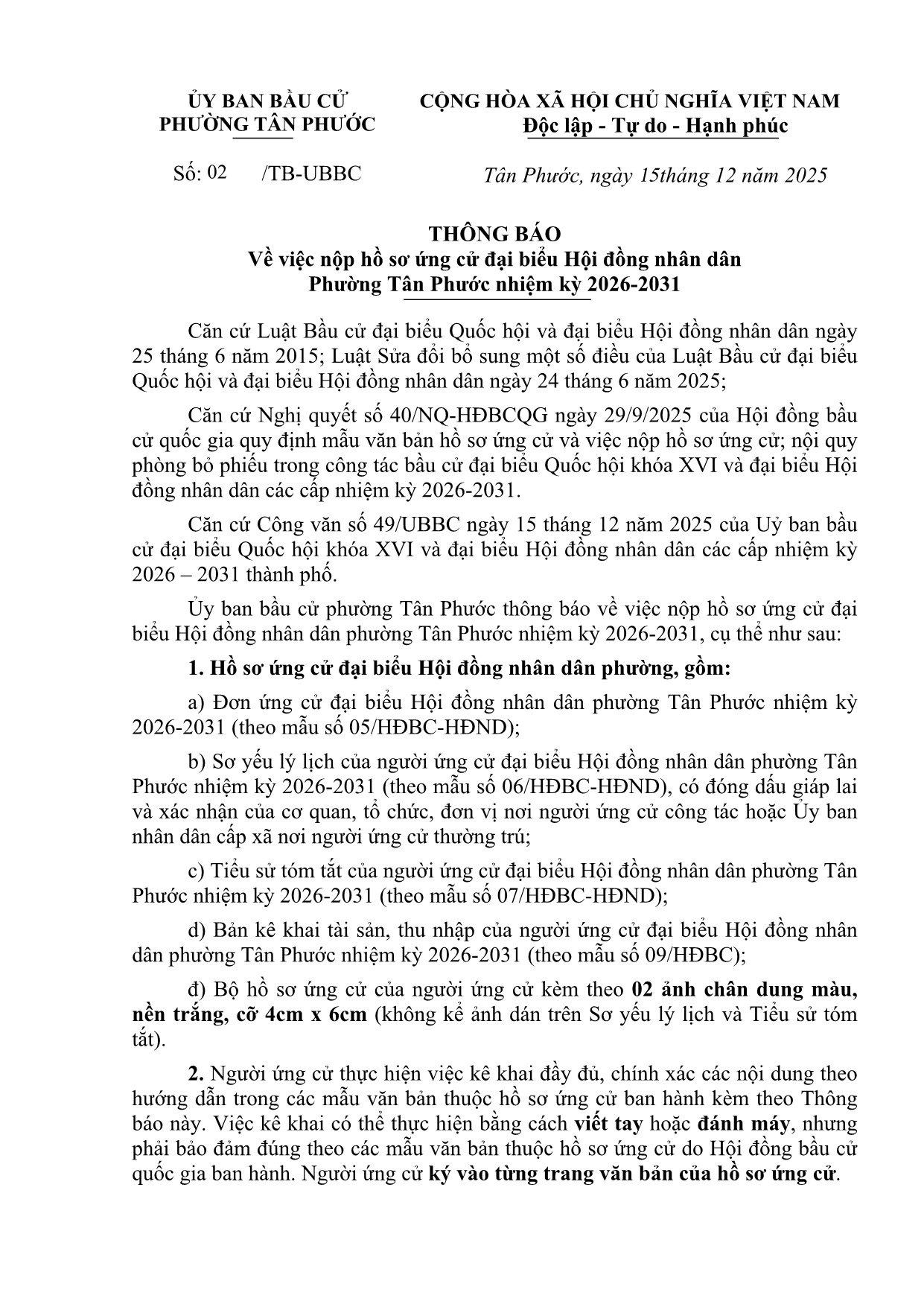 Uỷ ban bầu cử phường Tân Phước thông báo thời gian, địa điểm tiếp nhận hồ sơ ứng cử đại biểu Hội đồng nhân dân phường Tân Phước nhiệm kỳ 2026 – 2031.