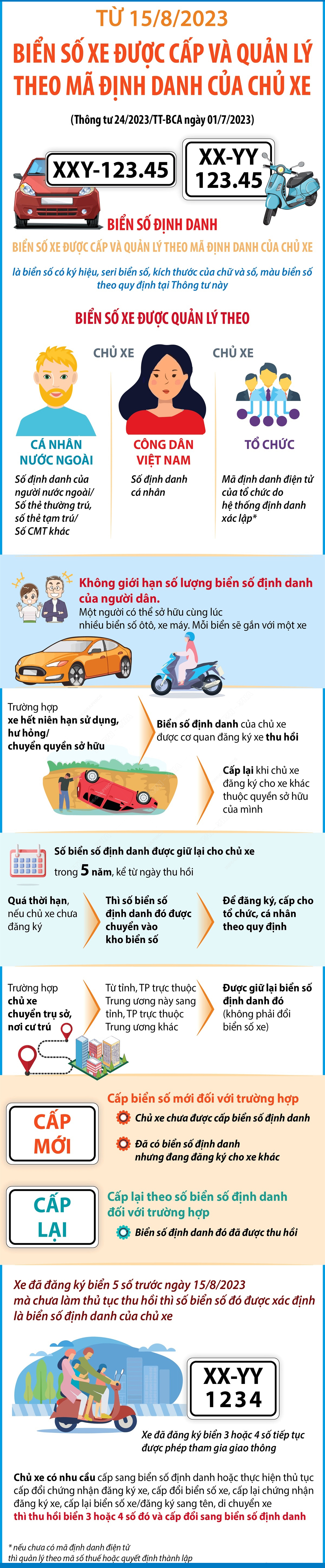 Theo Thông tư 24/2023/TT-BCA của Bộ Công an, từ 15/8/2023, biển số ô tô, xe máy sẽ được cấp và quản lý theo mã định danh của chủ xe, còn gọi là biển số định danh. Biển xe định danh sẽ đi theo chủ xe, chứ không đi theo xe, vì vậy, khi bán xe, chủ xe phải giữ lại giấy chứng nhận đăng ký xe, biển số xe và nộp cho cơ quan đăng ký xe để làm thủ tục thu hồi.