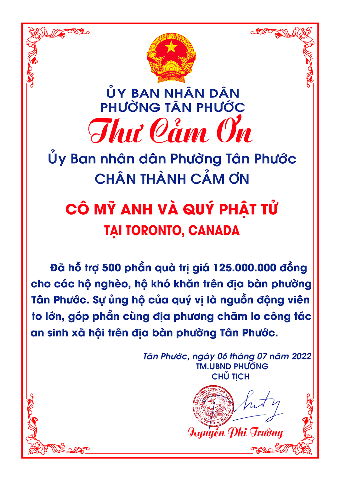 Lãnh đạo Phường Tân Phước trao thư cảm ơn đến Chùa Chuẩn Đề, Bà Mỹ Anh và các mạnh thường quân