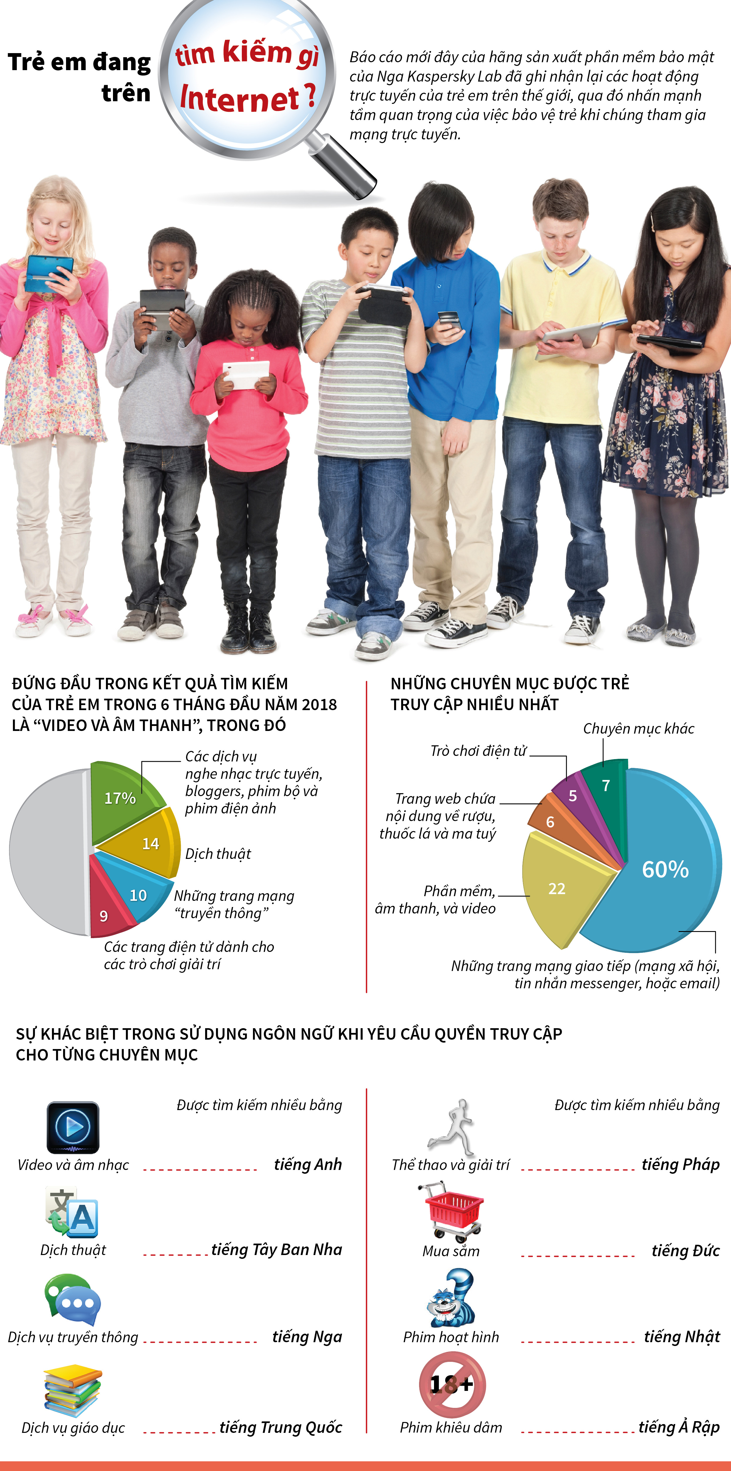 Báo cáo mới đây của hãng sản xuất phần mềm bảo mật của Nga Kaspersky Lab đã ghi nhận lại các hoạt động trực tuyến của trẻ em trên thế giới, qua đó nhấn mạnh tầm quan trọng của việc bảo vệ trẻ khi chúng tham gia mạng trực tuyến.