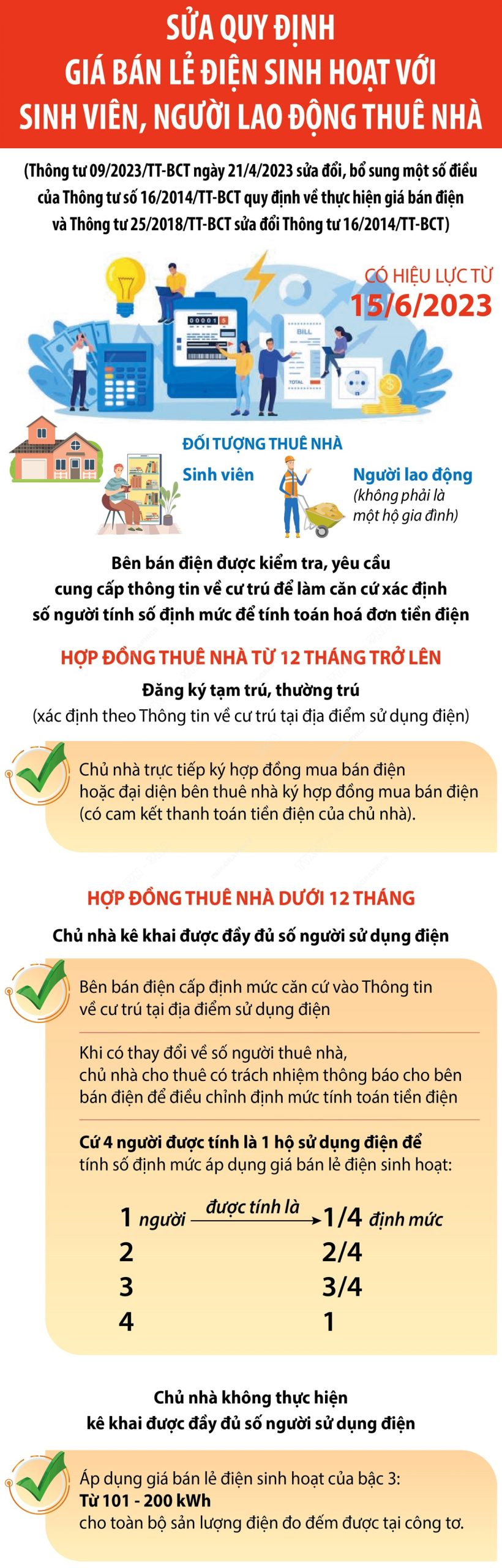 Bộ Tài chính ban hành Thông tư số 09/2023/TT-BCT ngày 21/4/2023 và Thông tư số 25/2018/TT-BCT có hiệu lực từ ngày 15/6/2023. Theo đó, giá bán lẻ điện sinh hoạt với sinh viên, người lao động thuê nhà có sự điều chỉnh.